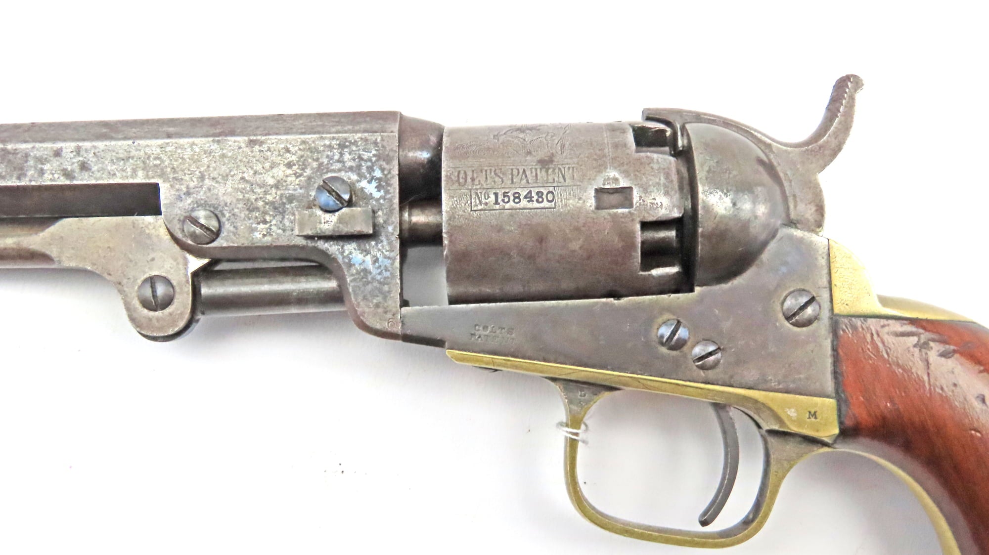 A Colt 1849 Pocket Revolver. 11 ½” overall, 6” barrel with 2 line ‘Adress Saml Colt New York City’. Cylinder with stagecoach scene. Action marked ‘Colt Patent’. Silver plated trigger guard, grip & back strap. Varnished walnut grips. Trigger guard & barrel with military inspectors’ stamps. Faintly engraved ‘7th ACO.’ on bottom of the butt.