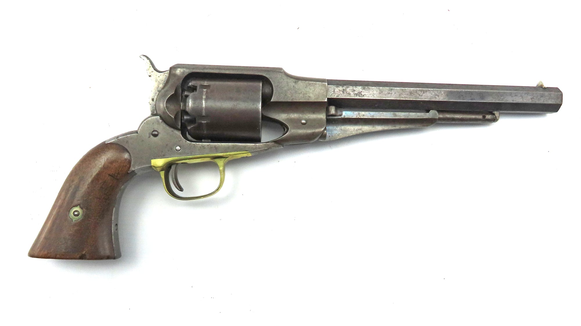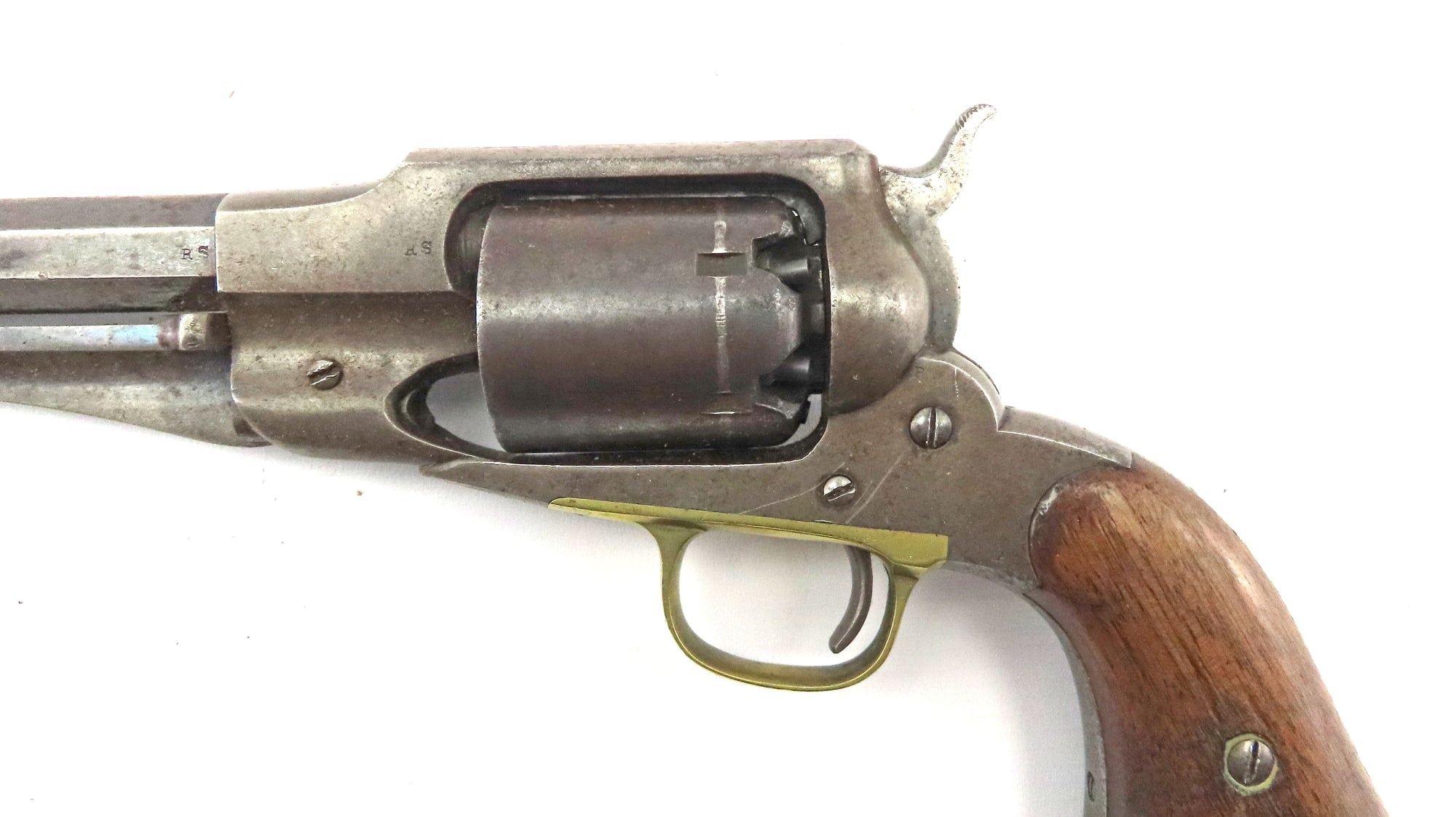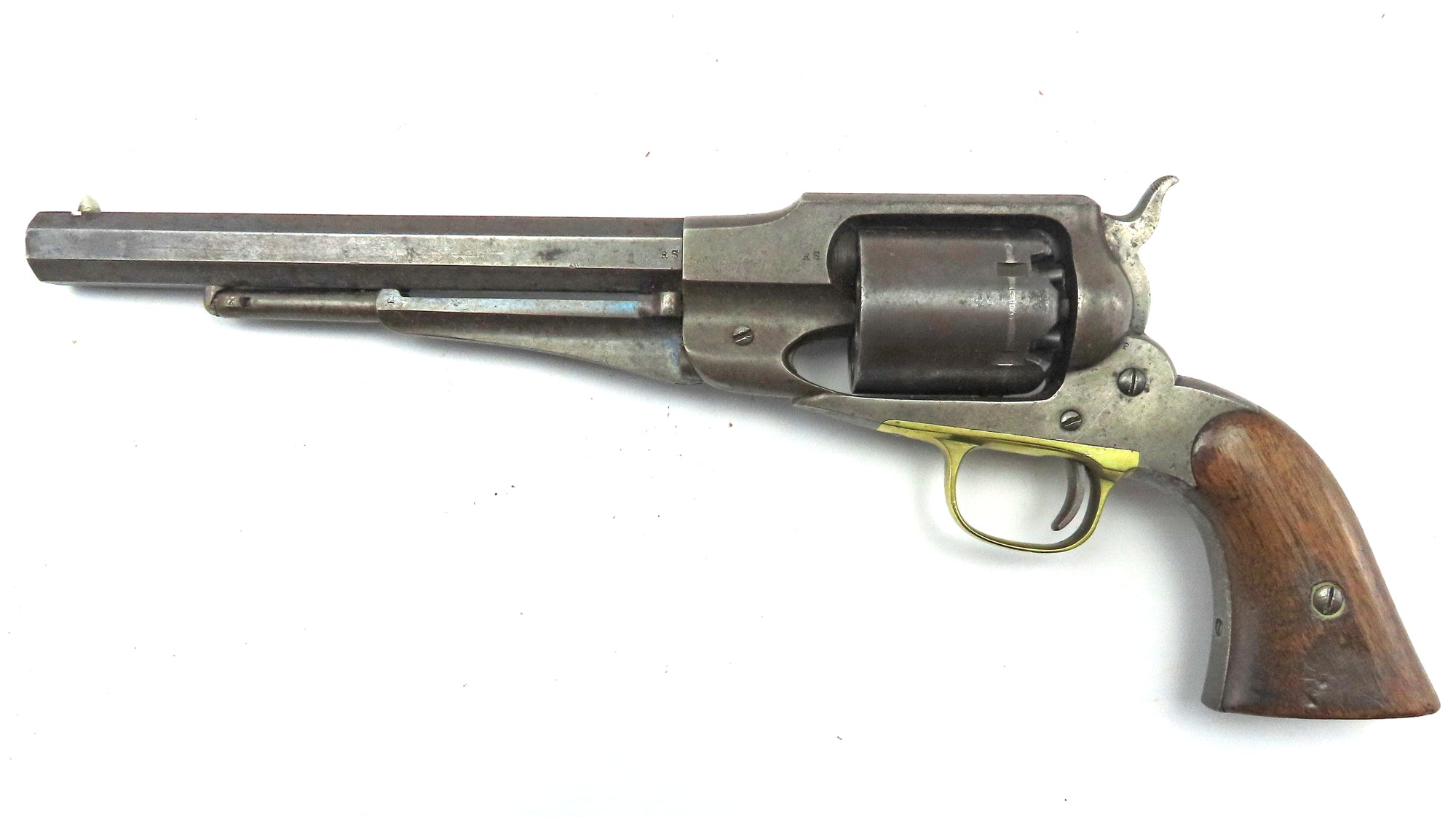 A Percussion .44 Calibre Remington 1861 Army Revolver. 14 ½” overall, 8” octagonal barrel with short blade foresight, engraved on top flat in two lines ‘Patented December 17th 1861Manufactured By Remington Sons, Illon , N Y’, stamped underneath number ‘7482’, solid frame with sighting groove on top strap. Hinged loading lever under barrel, six shot cylinder spur hammer, brass trigger guard. Walnut two piece grip with very faint inspector’s cartouche. Numerous ‘RS’ inspector’s marks on frame, barrel & cylinder. Named faintly ‘I. S. Bland O.V.I’ in pencil inside the grips. With contemporary brown leather military style holster.