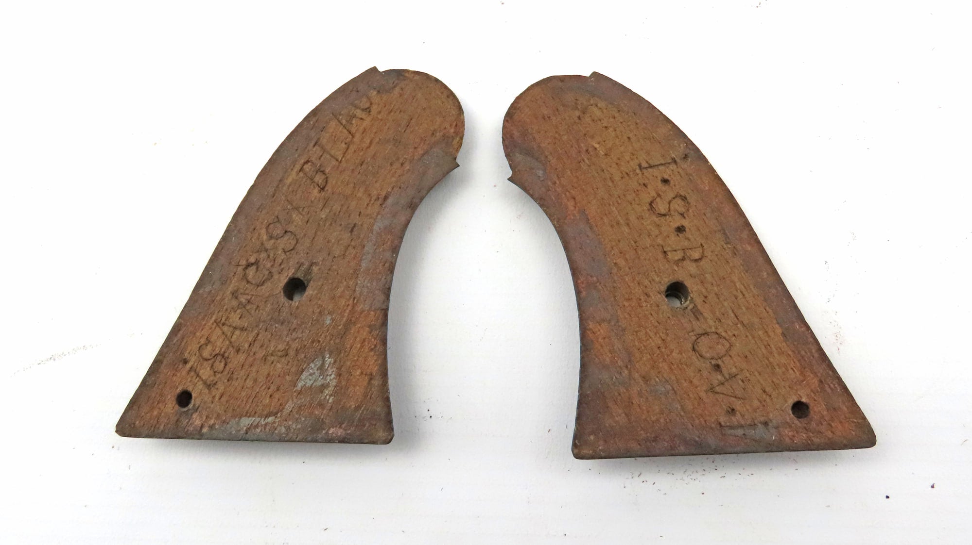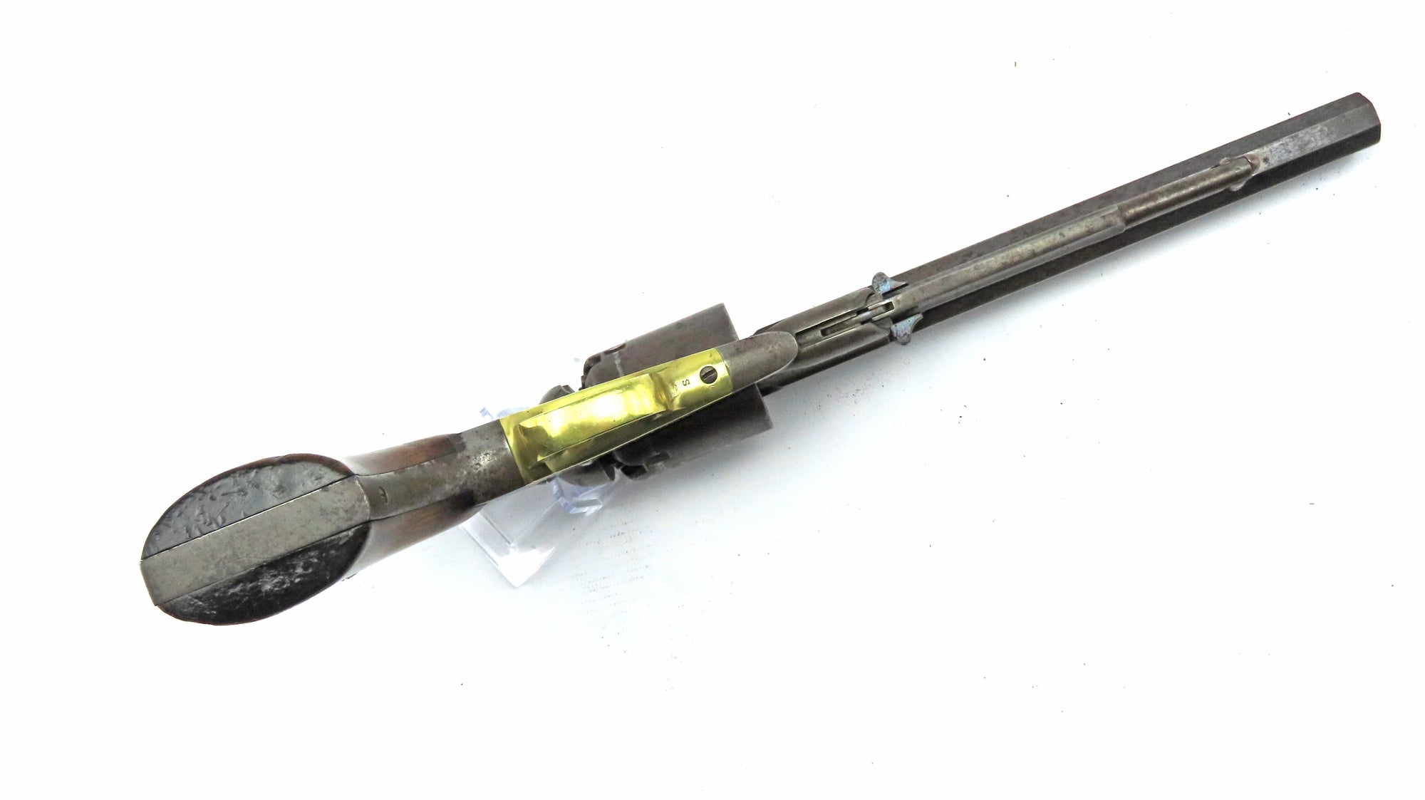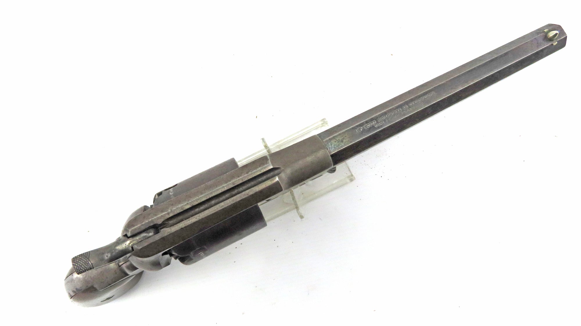 A Percussion .44 Calibre Remington 1861 Army Revolver. 14 ½” overall, 8” octagonal barrel with short blade foresight, engraved on top flat in two lines ‘Patented December 17th 1861Manufactured By Remington Sons, Illon , N Y’, stamped underneath number ‘7482’, solid frame with sighting groove on top strap. Hinged loading lever under barrel, six shot cylinder spur hammer, brass trigger guard. Walnut two piece grip with very faint inspector’s cartouche. Numerous ‘RS’ inspector’s marks on frame, barrel & cylinder. Named faintly ‘I. S. Bland O.V.I’ in pencil inside the grips. With contemporary brown leather military style holster.