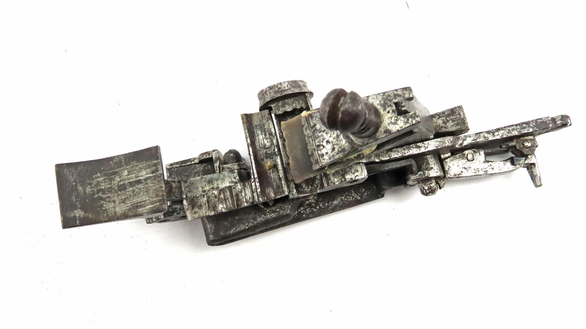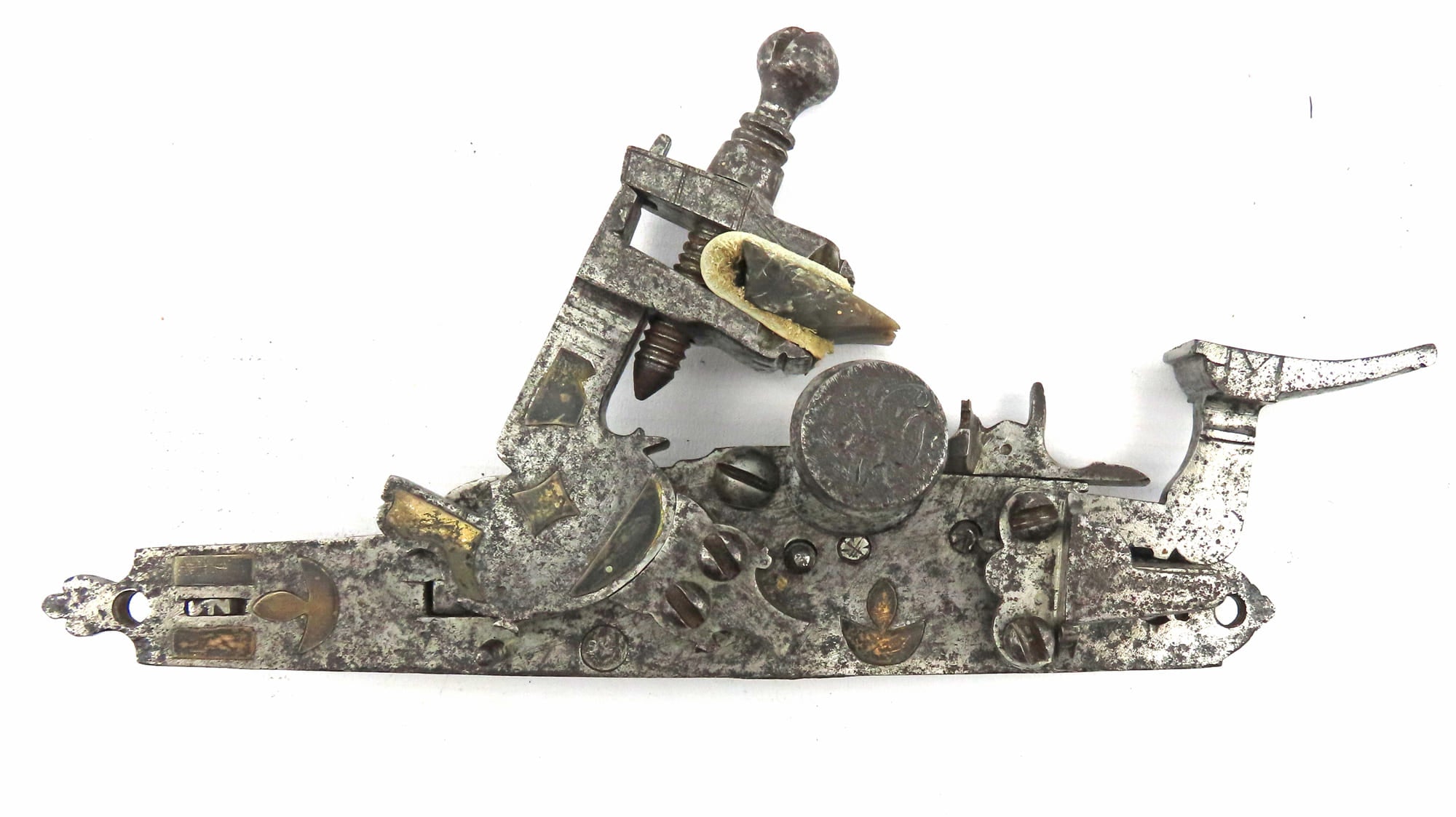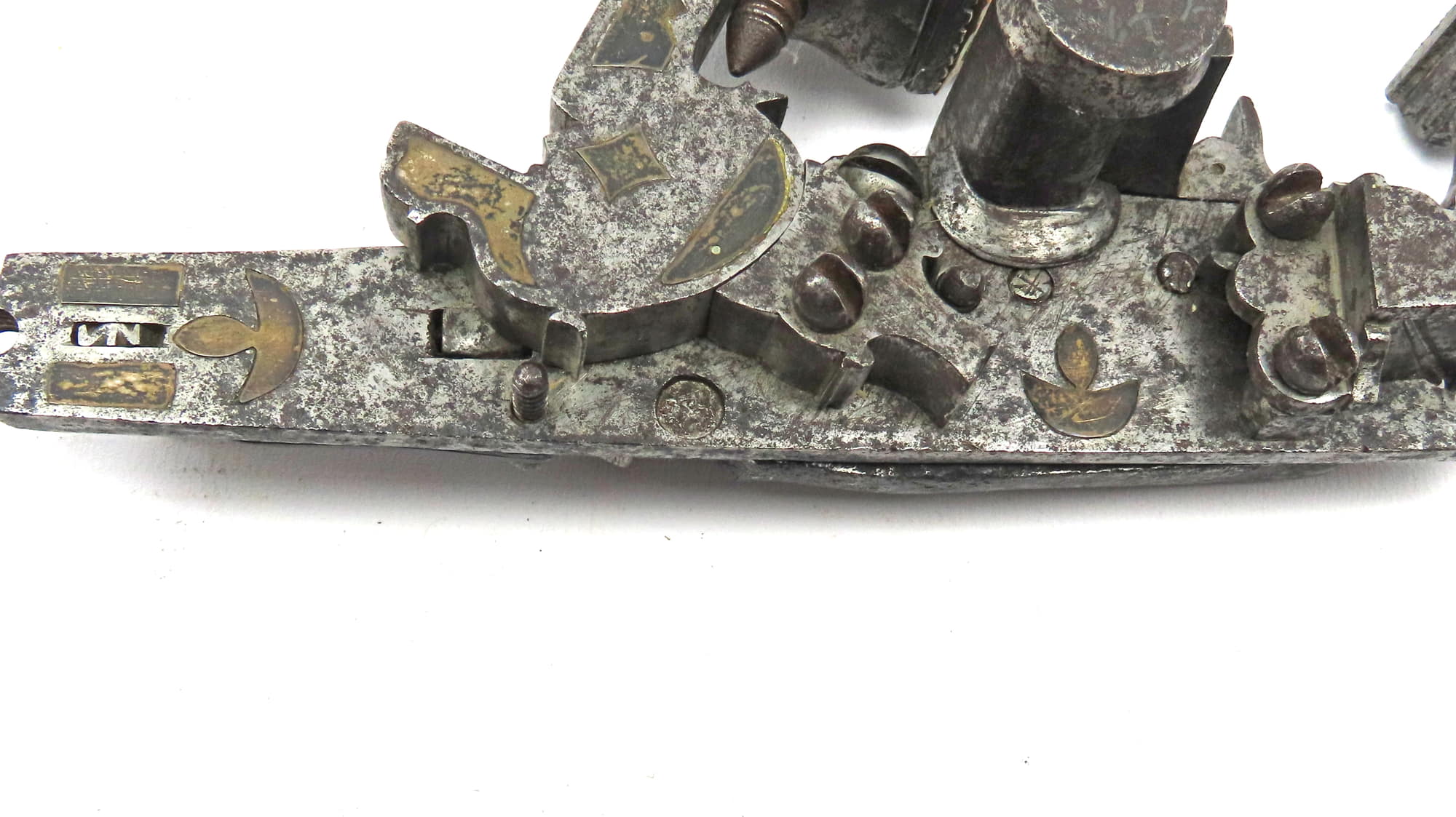 A Fine North African or Arabic Moukhala Snaphance Lock. 7 ½” long, flat iron lock plate with cusped tang. Silver inlay to lock plate, cock and pan fence.