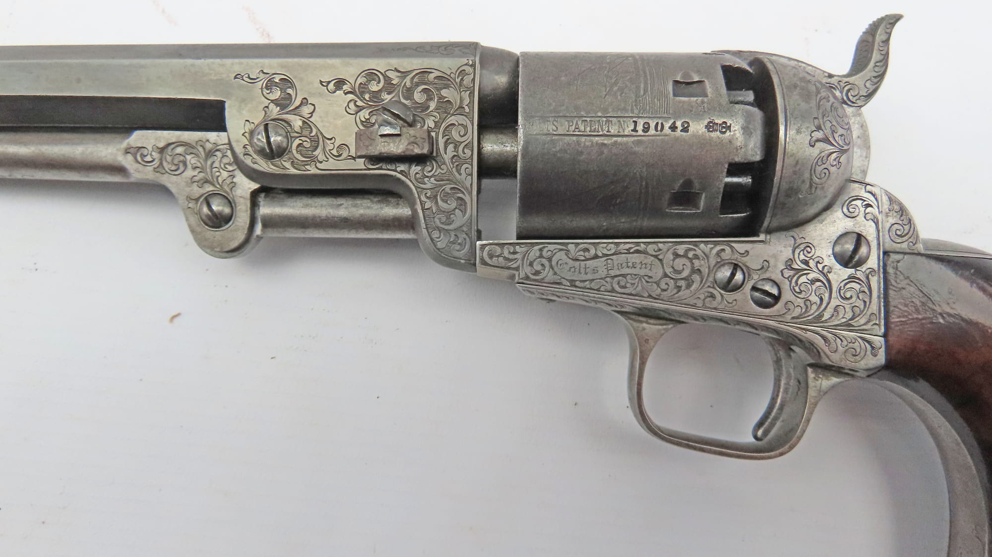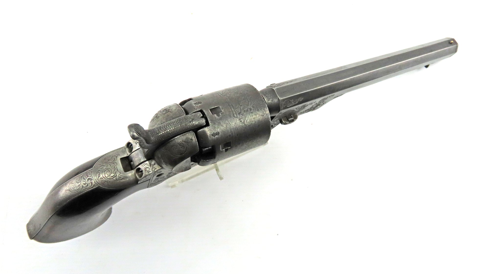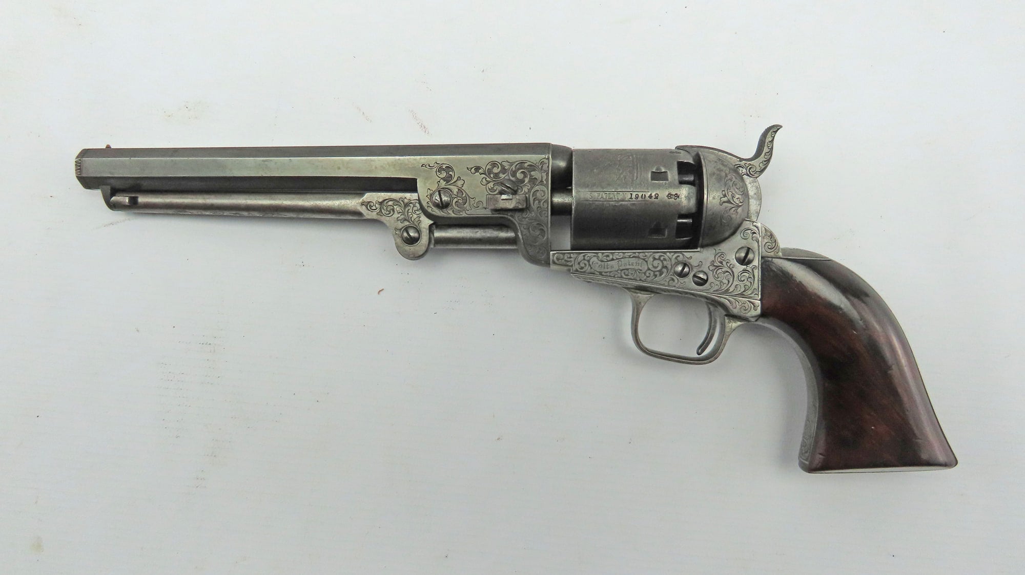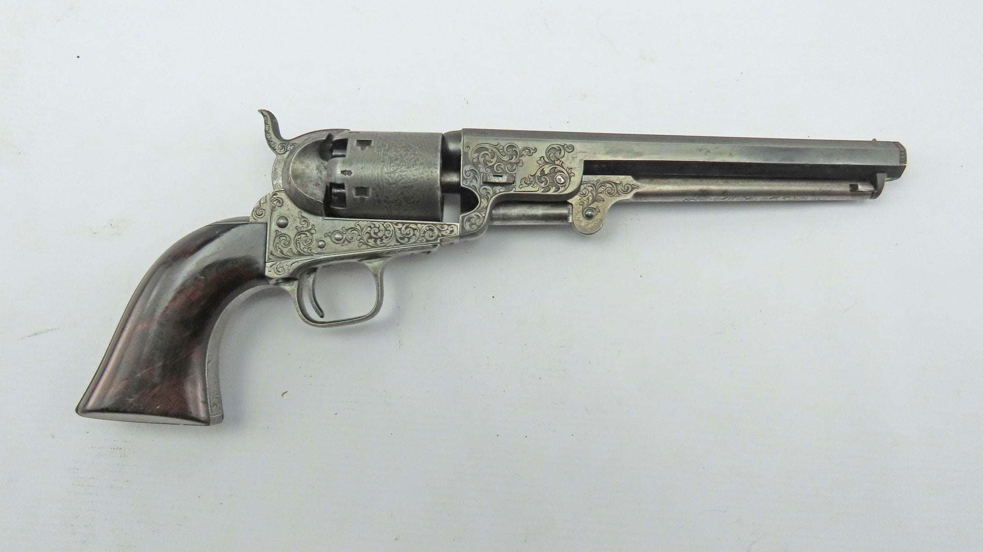 A Very Fine Cased Bank Note Engraved Colt London Navy Revolver. 13 ¾” overall, 7 ½” octagonal barrel with bead foresight & address ‘Col Colt London’ between arrows, London proof marks on cylinder, naval cylinder scene with ‘Engraved by W. H. Ormsby. New York’, frame stamped on left hand side ‘Colts patent’ in a scroll. Large silver plated trigger guard & backstrap, parts numbered 19042 over a dot (wedge not removed so cannot confirm numbered). Varnished figured walnut grips. In its original oak dark green velvet lined London case with ‘Directions for Loading Colt’s Pistols’ label in the lid, original accessories comprising a large Dixon Patent Colts Navy Flask’, Colts patent iron bullet mould, turnscrew, cleaning rod & Jackson cap tin.