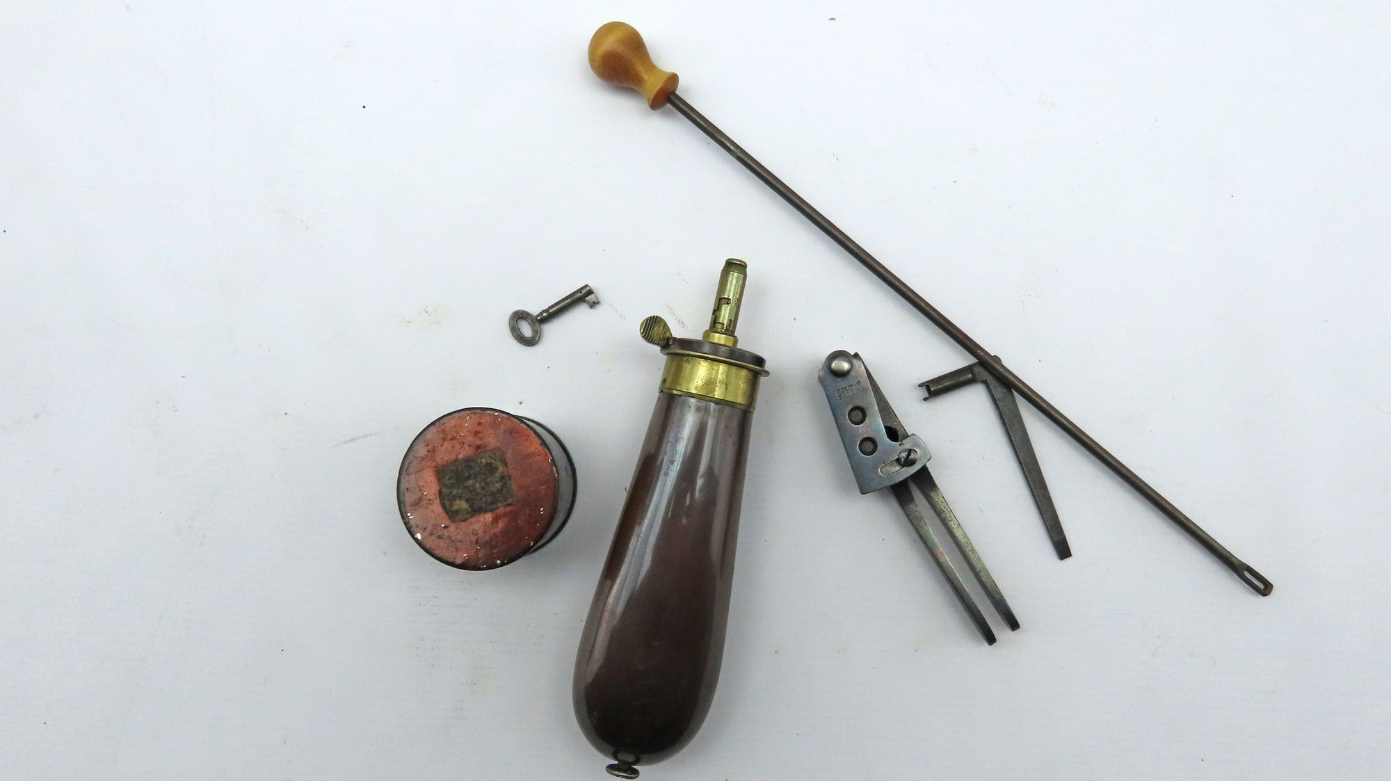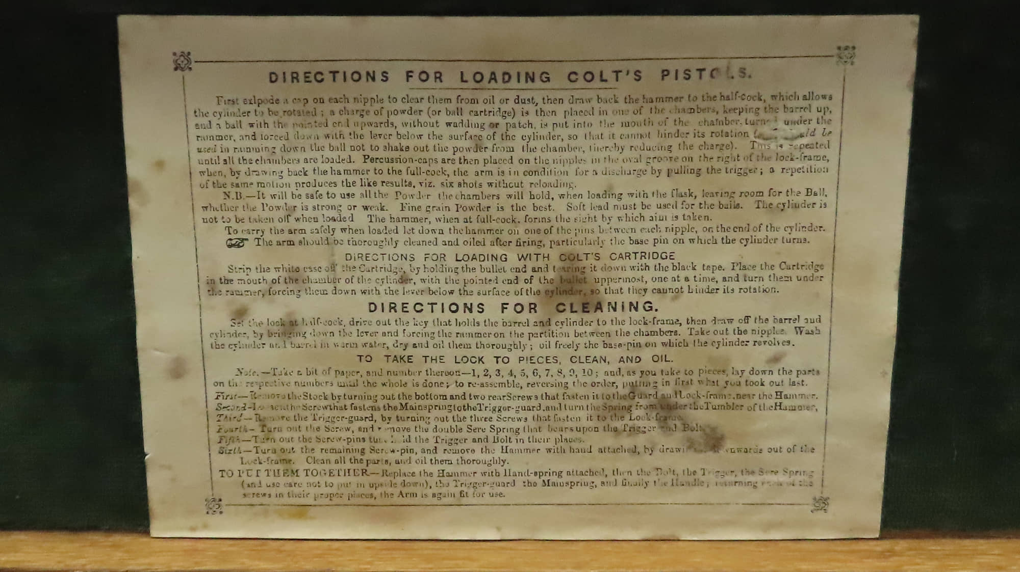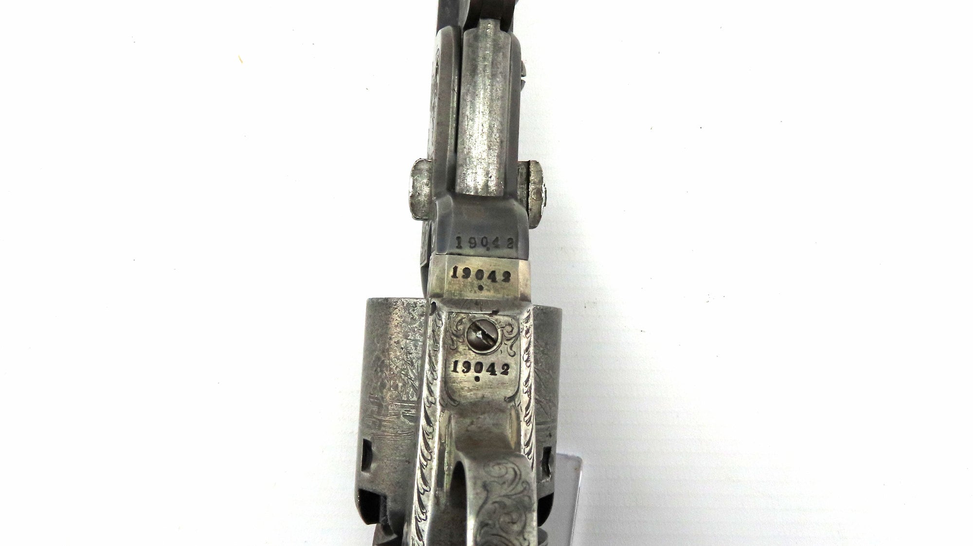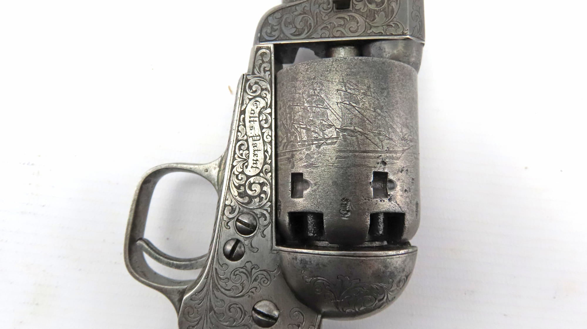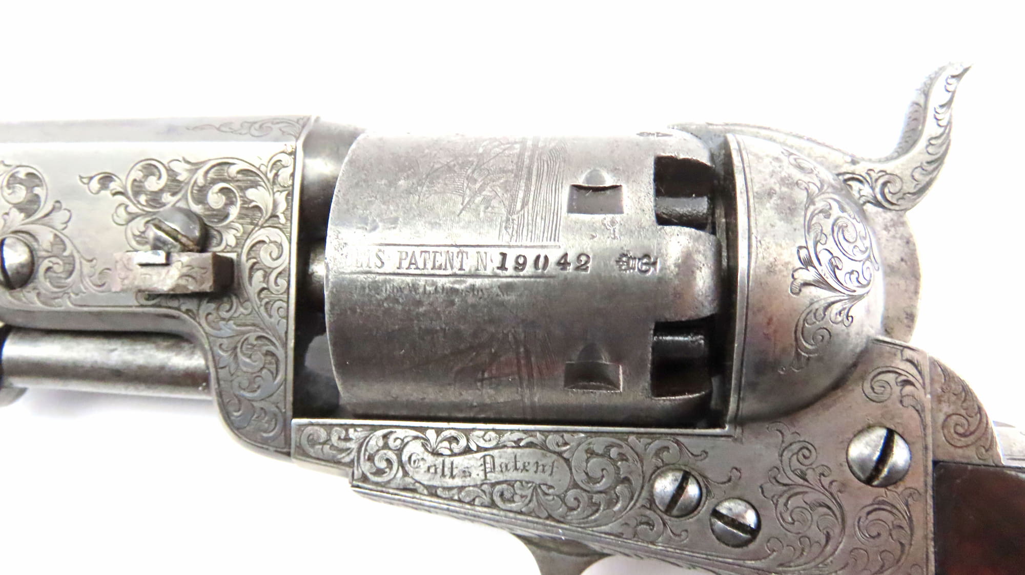 A Very Fine Cased Bank Note Engraved Colt London Navy Revolver. 13 ¾” overall, 7 ½” octagonal barrel with bead foresight & address ‘Col Colt London’ between arrows, London proof marks on cylinder, naval cylinder scene with ‘Engraved by W. H. Ormsby. New York’, frame stamped on left hand side ‘Colts patent’ in a scroll. Large silver plated trigger guard & backstrap, parts numbered 19042 over a dot (wedge not removed so cannot confirm numbered). Varnished figured walnut grips. In its original oak dark green velvet lined London case with ‘Directions for Loading Colt’s Pistols’ label in the lid, original accessories comprising a large Dixon Patent Colts Navy Flask’, Colts patent iron bullet mould, turnscrew, cleaning rod & Jackson cap tin.