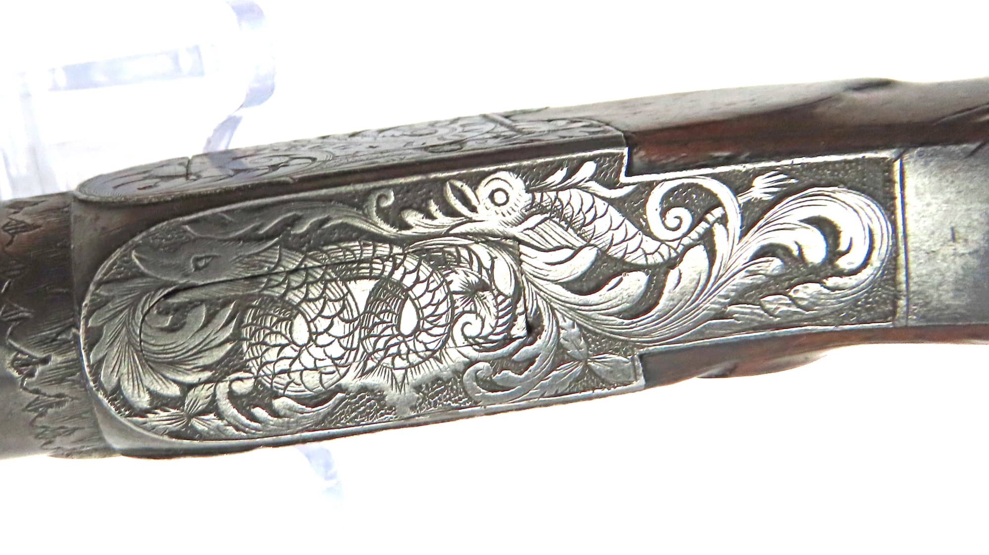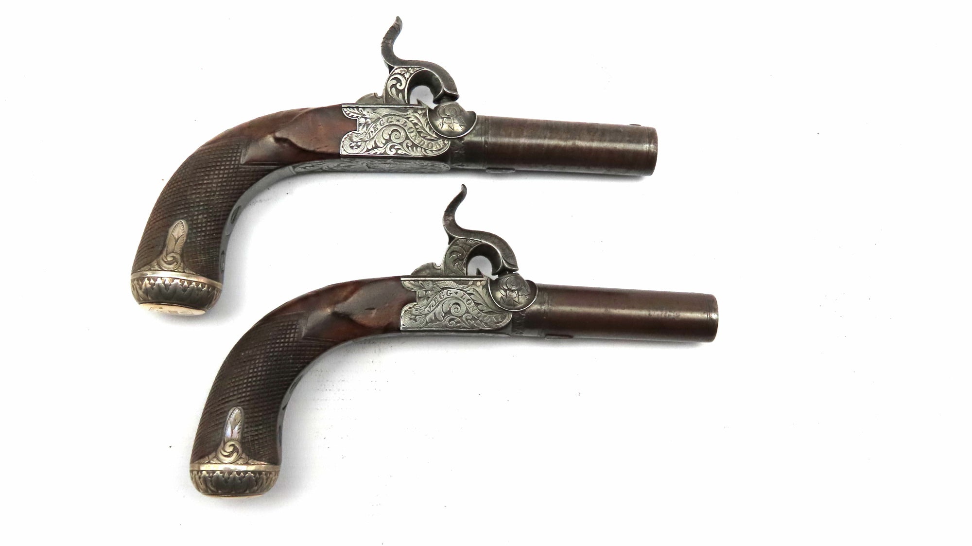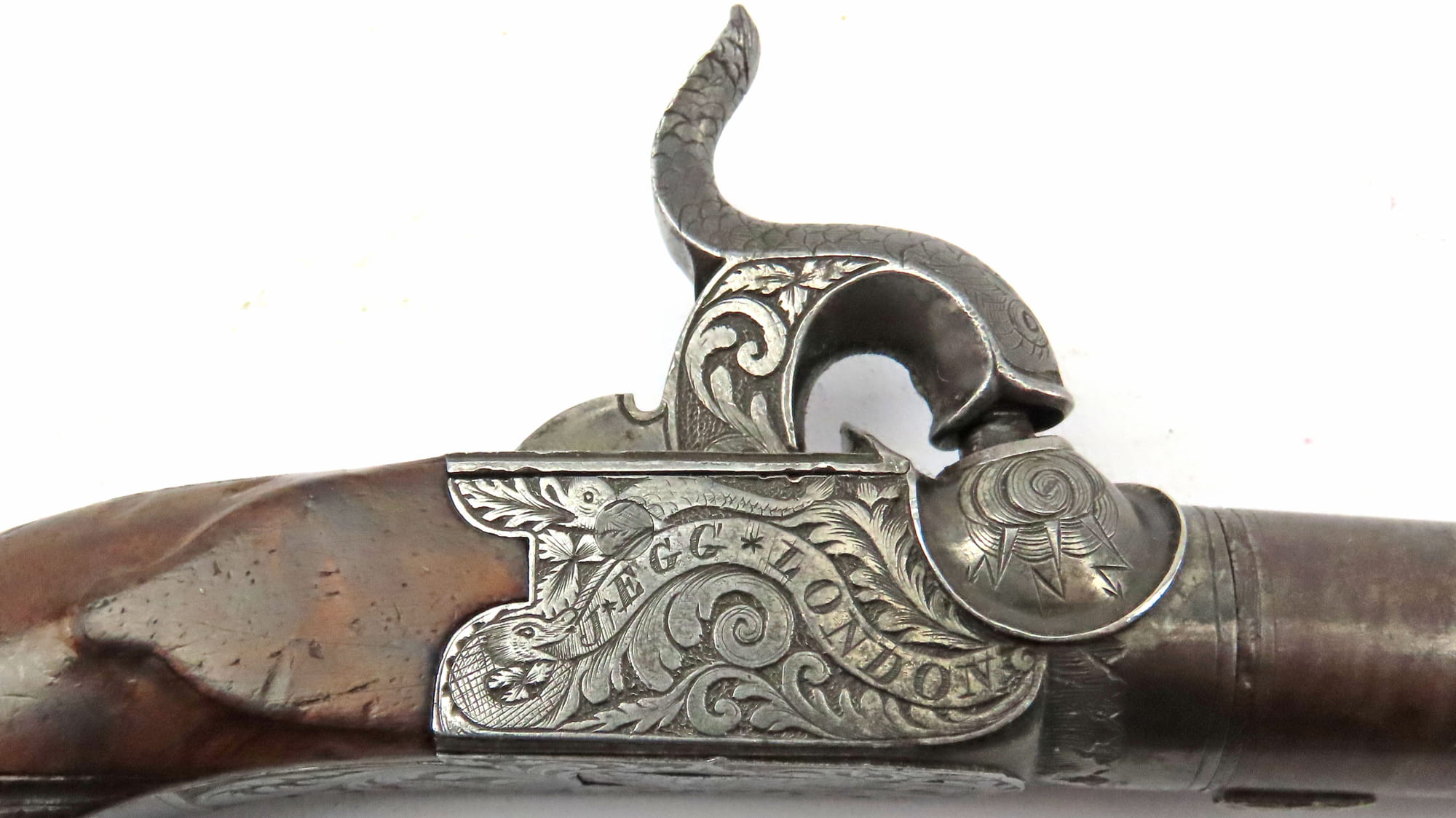 A Very Fine Cased Pair of Percussion Pocket Pistols by Joseph Egg with Silver & Gold Mounts. 7” overall, 2 ¼” turn-off 40 bore browned twist sighted barrels each engraved with a band of foliage at the muzzle, actions each signed 'J. EGG LONDON' on a ribbon & finely engraved with scrollwork inhabited by birds and serpents, offset scroll engraved hammers, concealed screws, folding triggers. Well figured chequered walnut butts, silver escutcheons, silver pommels each with short spurs & engraved with foliage & scrollwork, the base of each pommel set with a large gold escutcheon engraved with crest & moto ‘Martis non Cupidinis’ (Belonging to Mars, not Cupid], of the Fletcher family. In their original fitted mahogany case lined in dark green baize with original accessories including red leather covered three-way flask, bullet mould, barrel key, turnscrew, case key & loading rod, the lid with trade label of Joseph Egg.