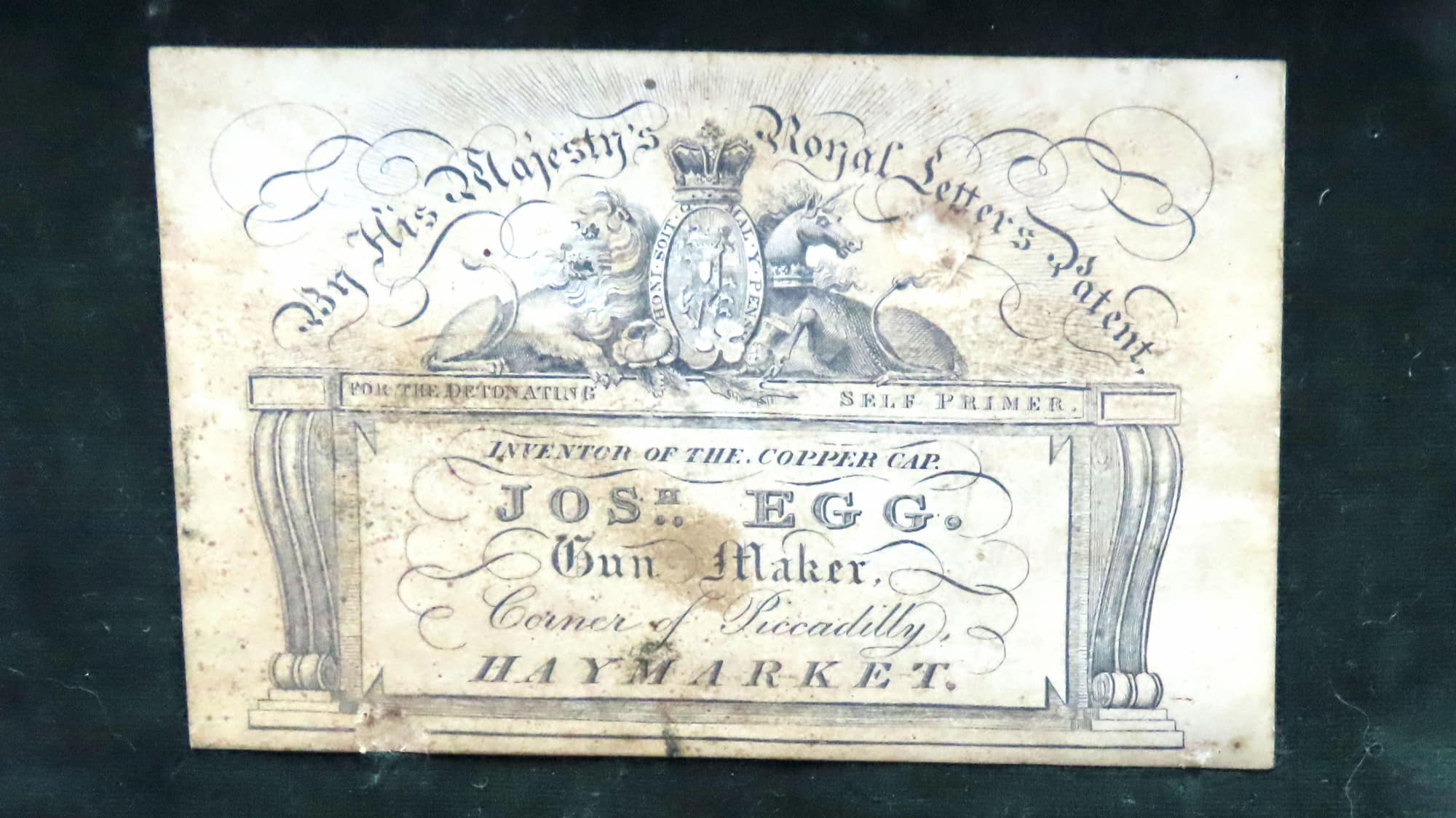 Joseph Egg was at 1 Piccadilly (corner of Piccadilly and Haymarket) from 1814 to 1834, and as Joseph & Sons and Joseph & Co. at the same address between 1835 and 1841. Egg claimed to have invented the copper cap as did several other gunmakers, it was introduced shortly before 1820. See Claude Blair, 'The Egg Family, Part 1 and Part 1 (contd.)', Journal of the Arms & Armour Society, Vol. VII (1973), pp. 266-299 and 306-353