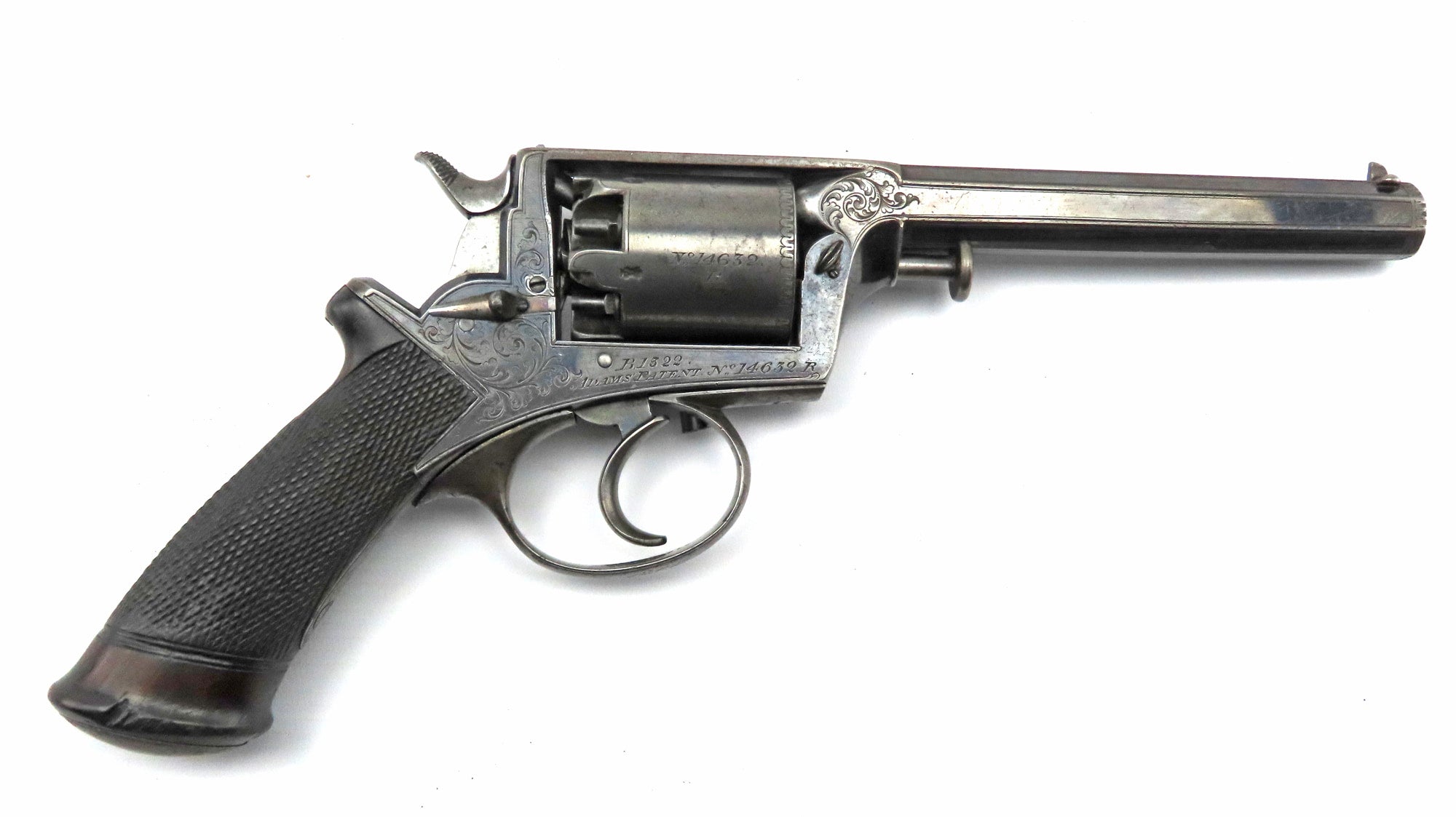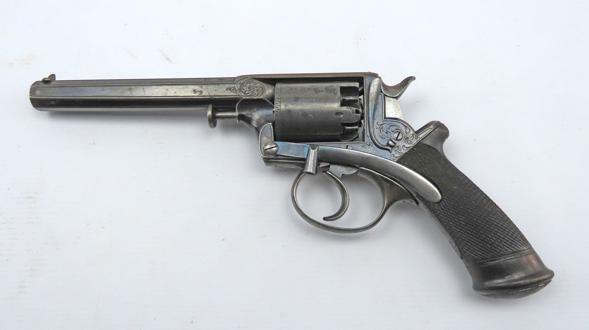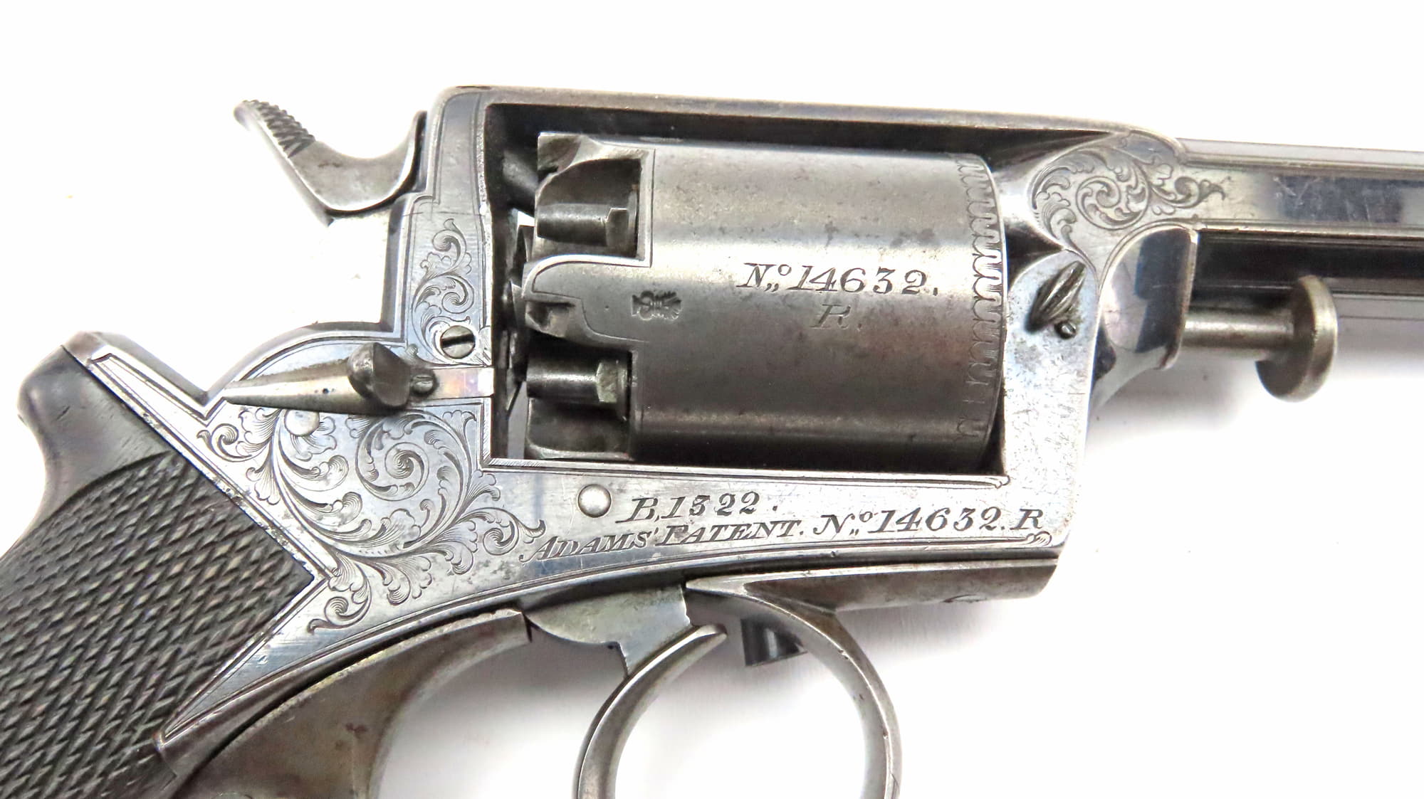 A Very Rare Early Cased Percussion Beaumont Adams Revolver. 13” overall, 6” blued 54 bore octagonal sighted barrel signed ‘Deane Adams & Deane. 30. King William ST,,T London Bridge’ on the top flat, border engraved on each flat, engraved at the muzzle & stamped with London proof marks. With the ‘Improved’ frame, Adams’ patent rammer fitted to left side of frame. Border engraved frame decorated with acanthus scroll work on each side, the right side of the frame engraved ‘B1322’ & ‘Adams’ Patent. No, 14632.R.’, the front frame stamped ‘DA&’ & ‘54’. Cylinder stamped with London proof marks, engraved with serial number ‘No,, 14,632. R’ & engraved at the forward edge & border engraved at the rear edge, faint case hardening colours. Spring safety catch on left, sliding safety bolt on right, arbor pin & screw catch, border engraved trigger guard decorated with acanthus scroll work, butt straps decorated with scroll work. Broad chequered walnut butt with border engraved iron butt plate, butt trap decorated with scroll work. In its original purple baize lined & fitted oak case with plain brass escutcheon on the lid, Deane and Son trade label inside the lid. With original accessories comprising double cavity brass 54 bore Adams’ patent bullet moulds stamped ‘Registered R. Adams 28 Nov. 1851’ & ‘54’ for two bullets, wood loading/cleaning rod with worm, oil bottle, bag shaped copper flask by James Dixon & Sons, nipple key with pricker, turn screw & a leather cap bag with label.