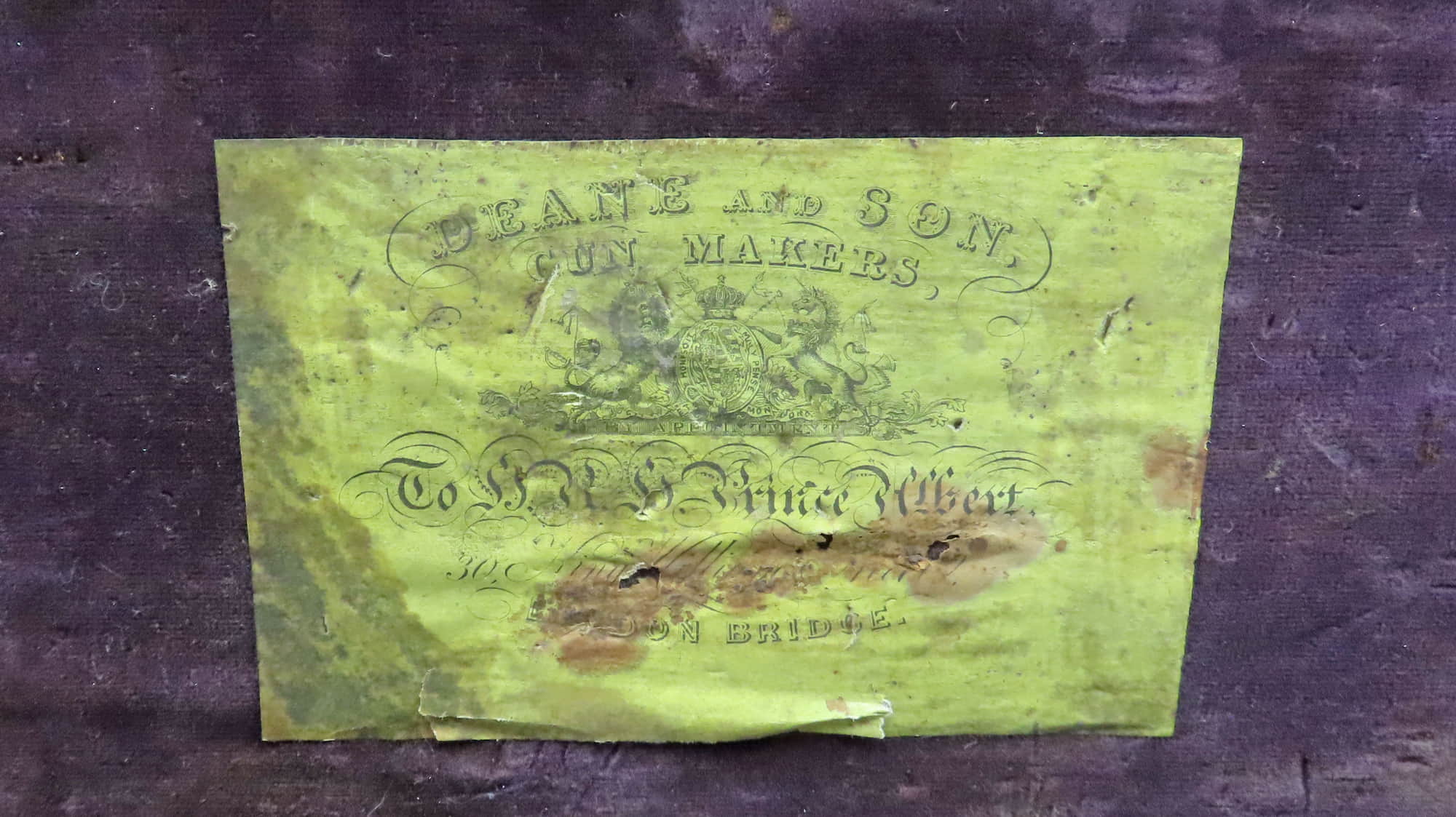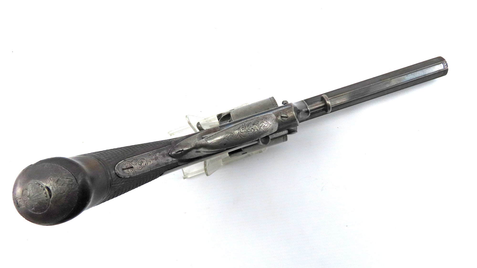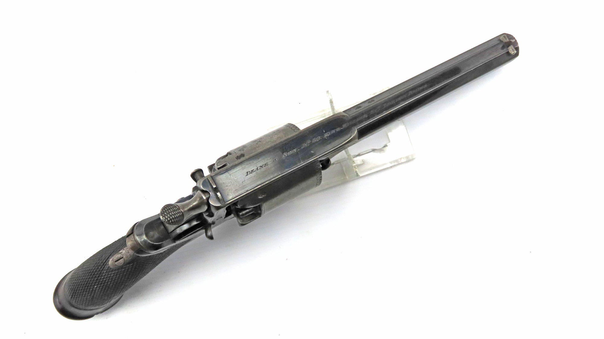 A Very Rare Early Cased Percussion Beaumont Adams Revolver. 13” overall, 6” blued 54 bore octagonal sighted barrel signed ‘Deane Adams & Deane. 30. King William ST,,T London Bridge’ on the top flat, border engraved on each flat, engraved at the muzzle & stamped with London proof marks. With the ‘Improved’ frame, Adams’ patent rammer fitted to left side of frame. Border engraved frame decorated with acanthus scroll work on each side, the right side of the frame engraved ‘B1322’ & ‘Adams’ Patent. No, 14632.R.’, the front frame stamped ‘DA&’ & ‘54’. Cylinder stamped with London proof marks, engraved with serial number ‘No,, 14,632. R’ & engraved at the forward edge & border engraved at the rear edge, faint case hardening colours. Spring safety catch on left, sliding safety bolt on right, arbor pin & screw catch, border engraved trigger guard decorated with acanthus scroll work, butt straps decorated with scroll work. Broad chequered walnut butt with border engraved iron butt plate, butt trap decorated with scroll work. In its original purple baize lined & fitted oak case with plain brass escutcheon on the lid, Deane and Son trade label inside the lid. With original accessories comprising double cavity brass 54 bore Adams’ patent bullet moulds stamped ‘Registered R. Adams 28 Nov. 1851’ & ‘54’ for two bullets, wood loading/cleaning rod with worm, oil bottle, bag shaped copper flask by James Dixon & Sons, nipple key with pricker, turn screw & a leather cap bag with label.