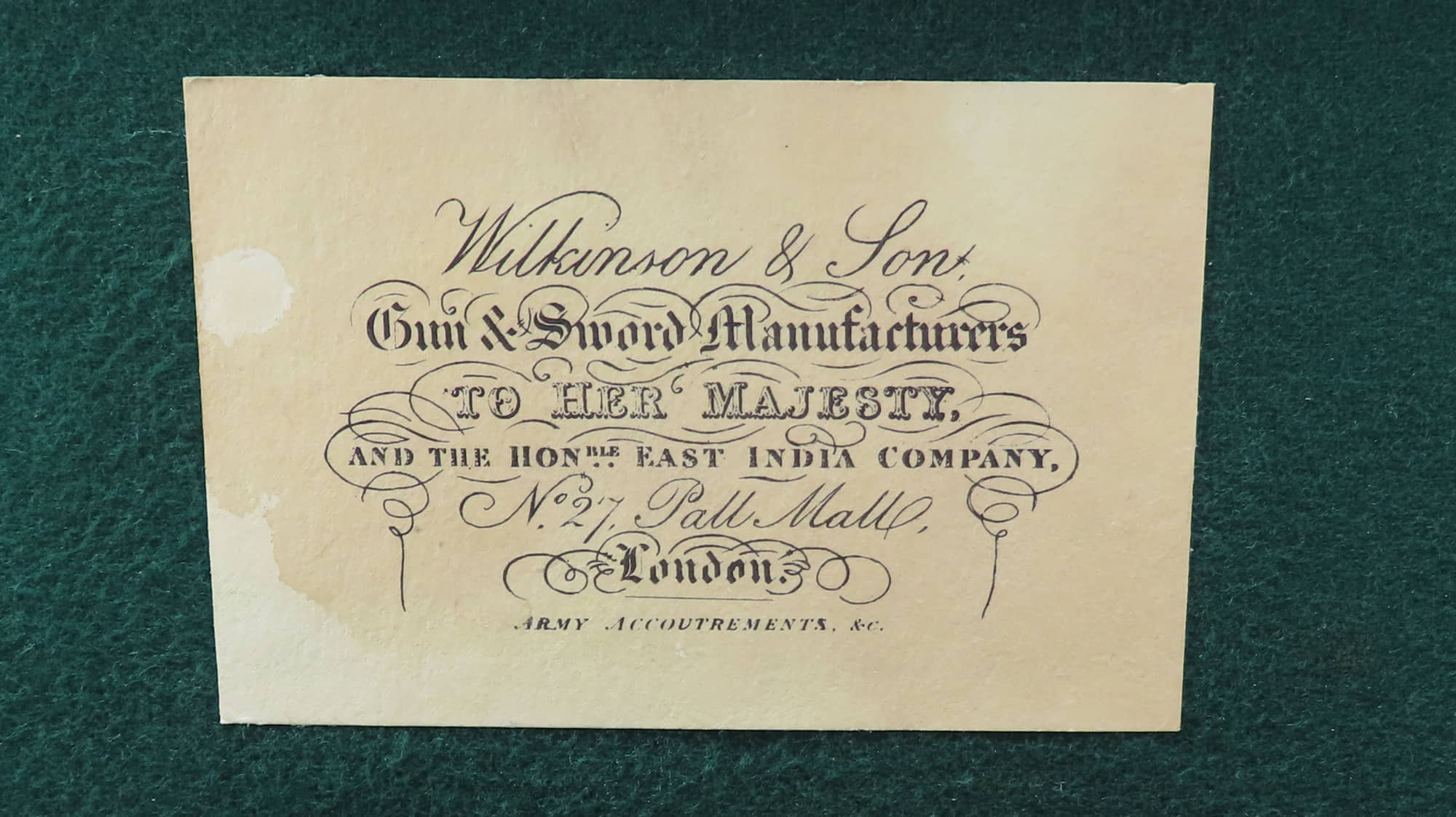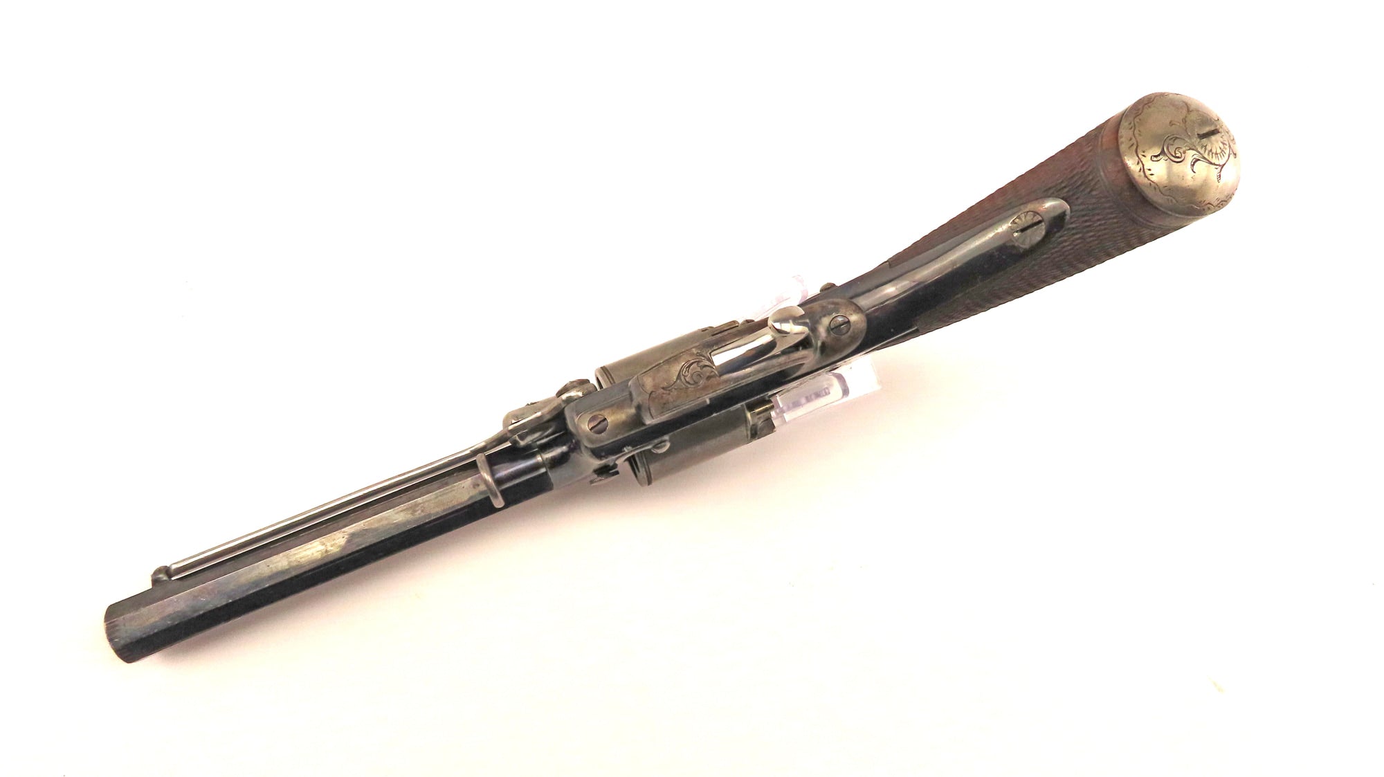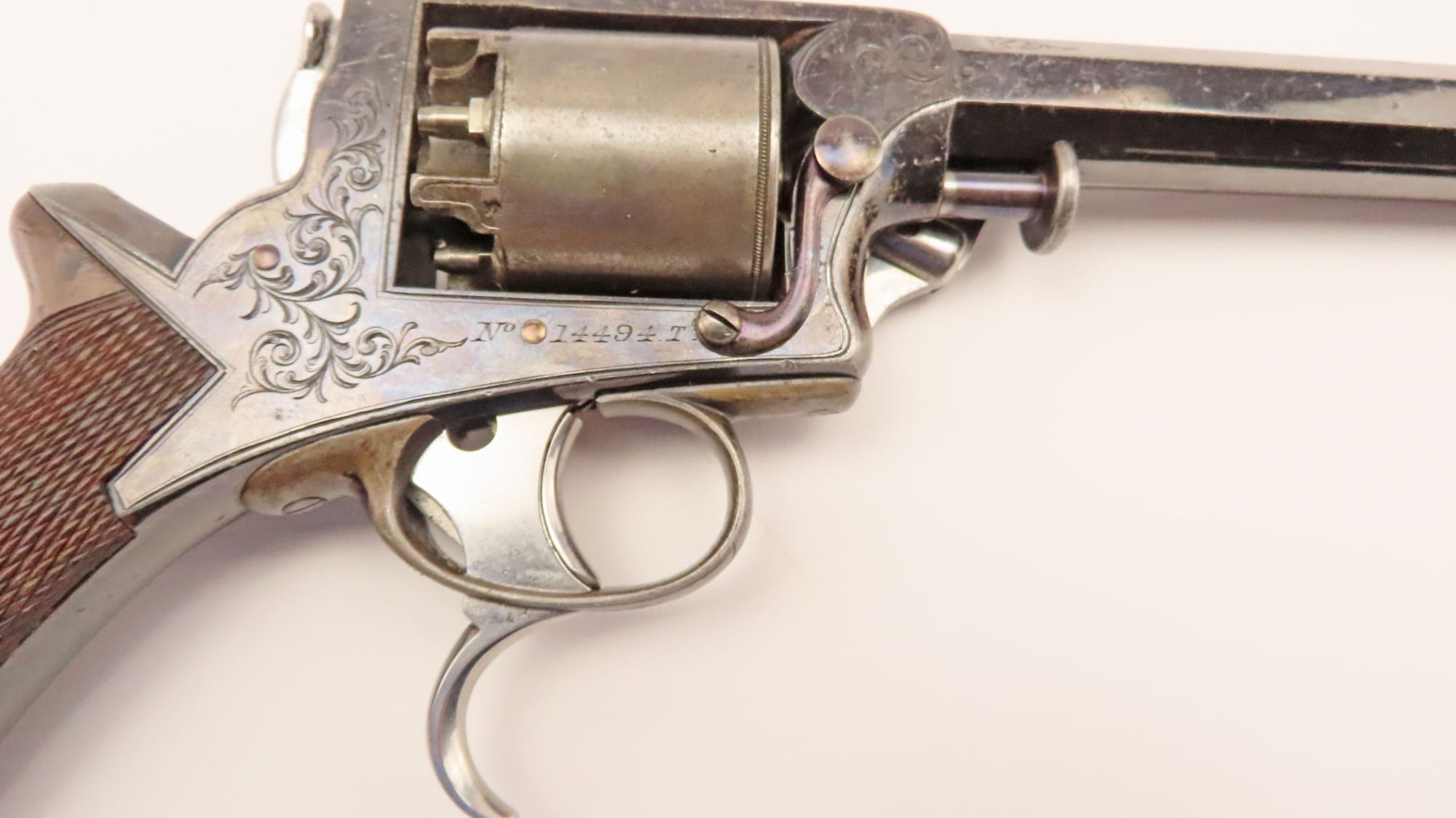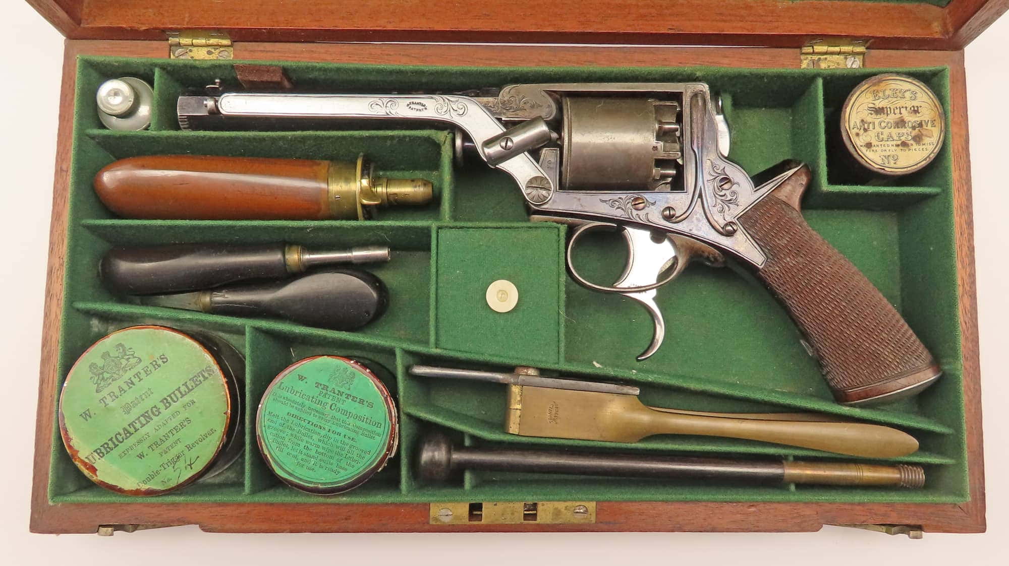 A Very Fine Cased 54 Bore Third Model Percussion Tranter Revolver by Wilkinson. 13” overall, 6” octagonal sighted barrel with engraving at muzzle & breech. Top flat engraved with the owners name ‘James Rigg Chester’. Blued steel border engraved solid frame engraved to one side 'No 14494T' & sprung knob to retain/release cylinder pin, the other side with blued rammer engraved 'W Tranters Patent', Y shaped safety spring, 5 shot cylinder with roped band & Birmingham proof marks, blued trigger guard with polished spurred triggers. Finely chequered walnut grips, engraved butt cap. Contained in its original green baize lined screwed lid mahogany case with original accessories including bullet and cap tins, bullet mould, turn screw, nipple key, oil bottle, loading rod, spare nipples and Dixon bag shaped flask. With Wilkinson & Son 27 Pall Mall trade label in the lid.