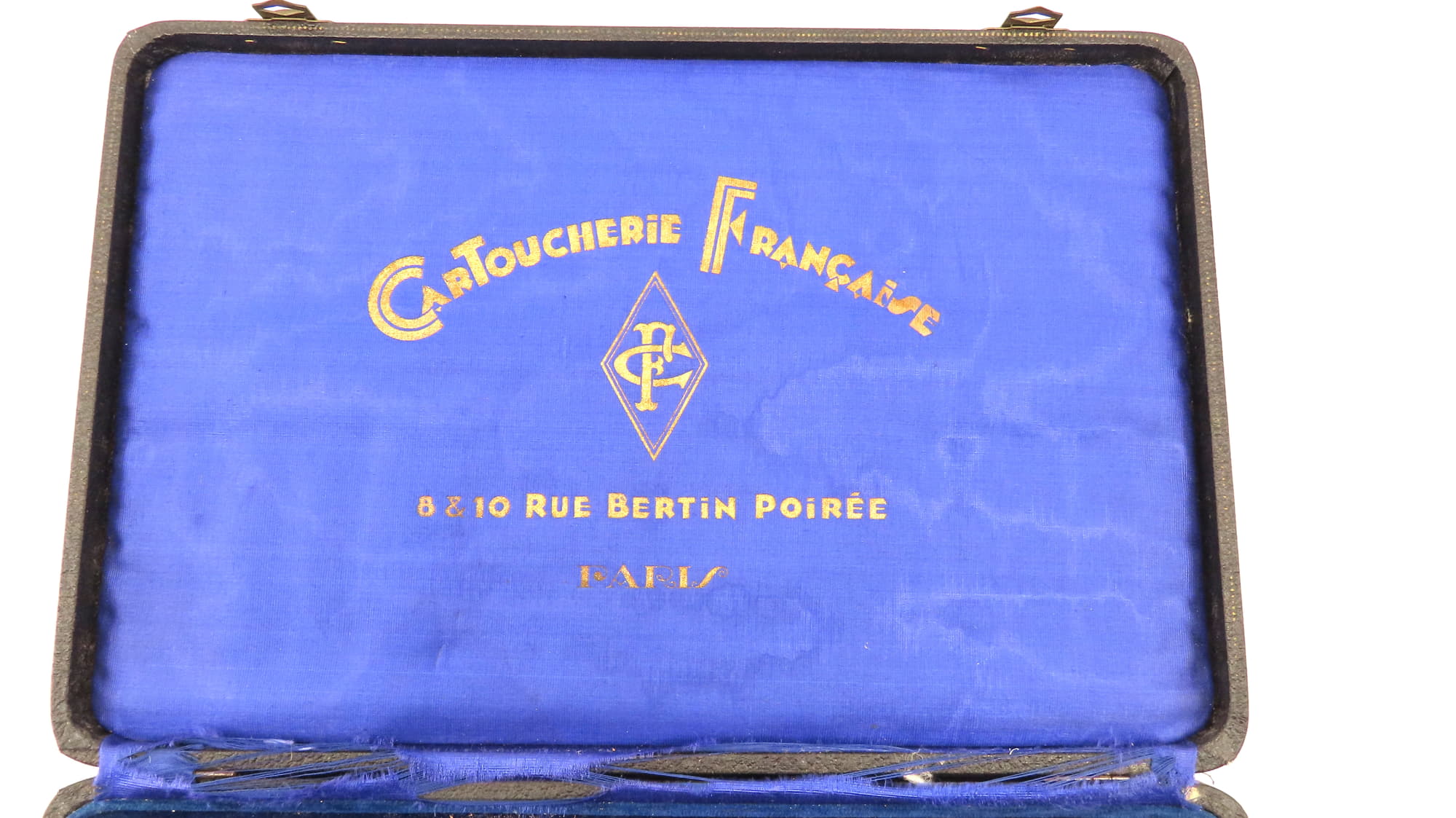 A Very Rare Salesmans Sample Case of Cartridges By Cartoucherie Francaise. Black leatherette case with blue velvet lining 12 ½” x 8 ½” with 25 sporting shotgun sample cases including pinfire cases, with cut out cases and sectioned primers in a variety of bore sizes & calibres, sundry wads, top-cards & primers