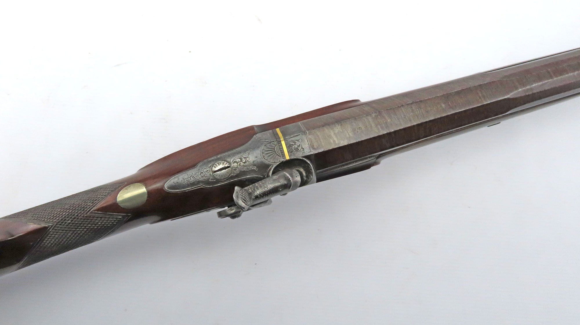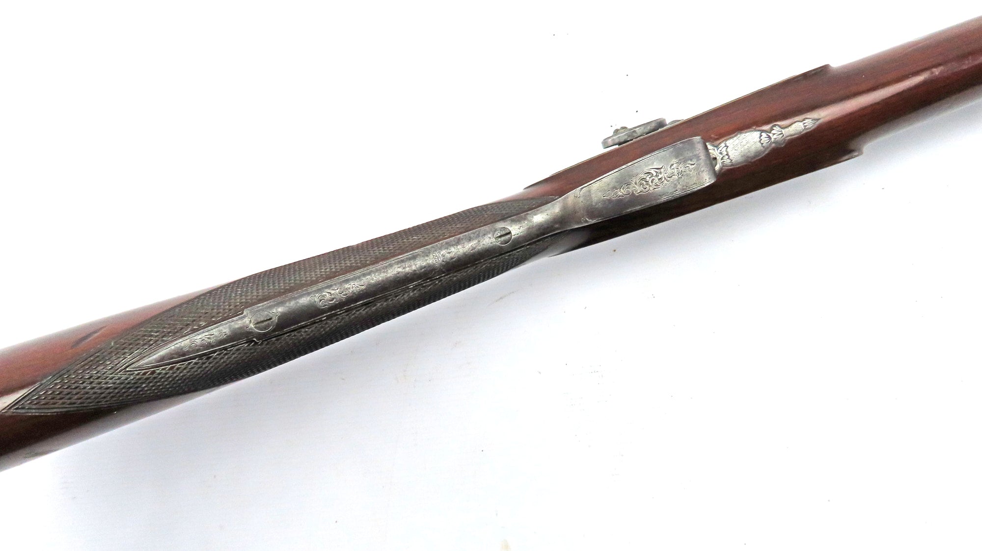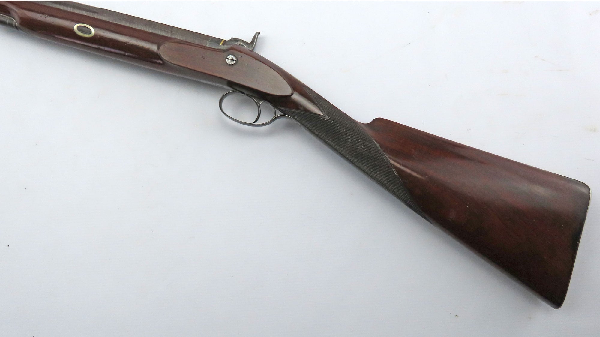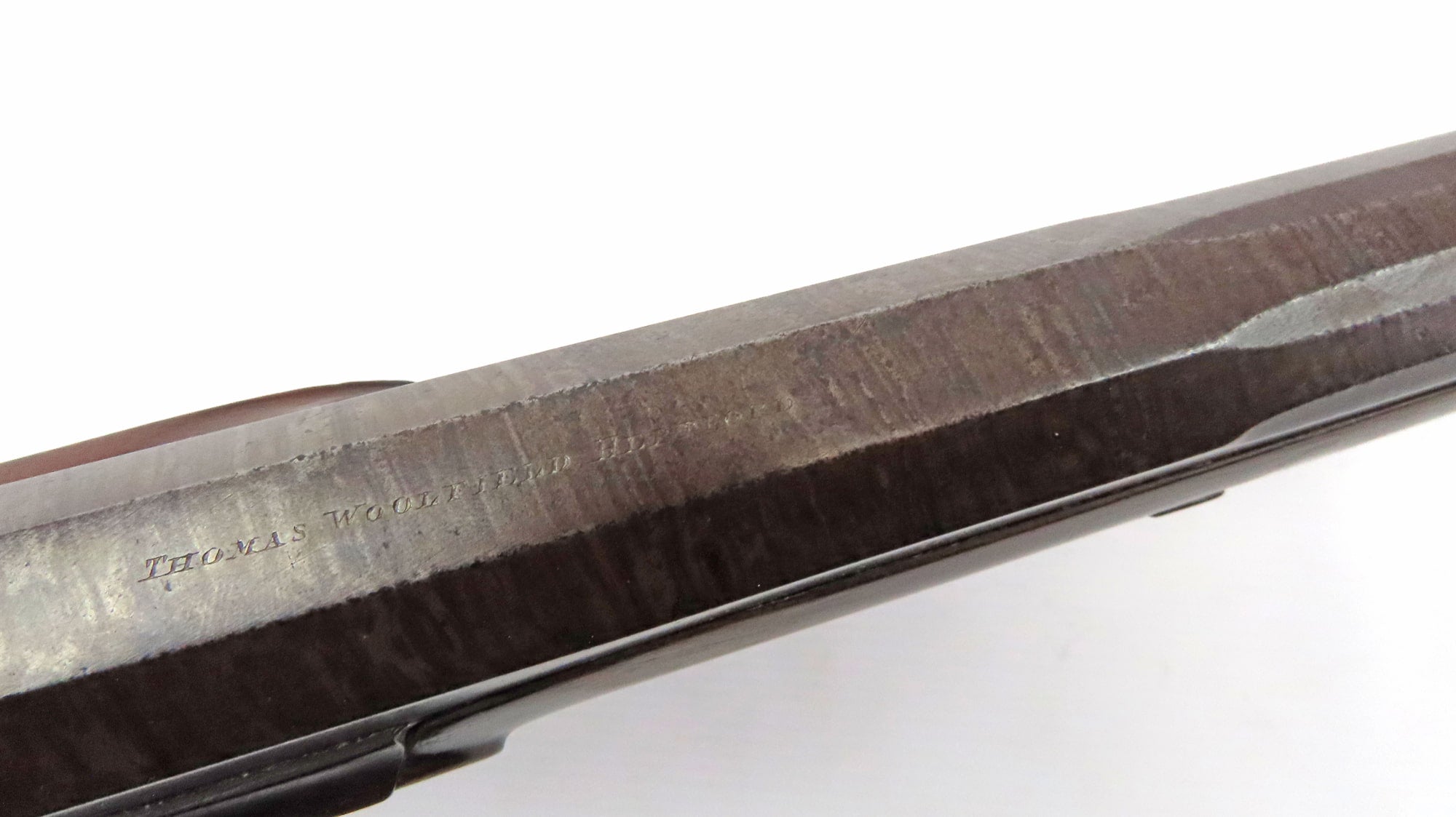 Single Barrelled 14 Bore Percussion Sporting Gun. 48” overall, 32” 16 bore octagonal three stage Spanish barrel signed ‘Thomas Woolfield Hertford’ on the top flat, bead foresight, Birmingham Proofs on the bottom flat, Gold line at the breech, flat engraved lock plate signed ‘Thomas Woolfield’ with flat dolphin hammer, nipple with platinum vent. Walnut half stock, chequered at the wrist, iron butt plate, engraved trigger guard with pineapple finial, horn fore end. Barrel retained by one slide, original ebony brass tipped ramrod with a worm carried in two brass ramrod pipes.
