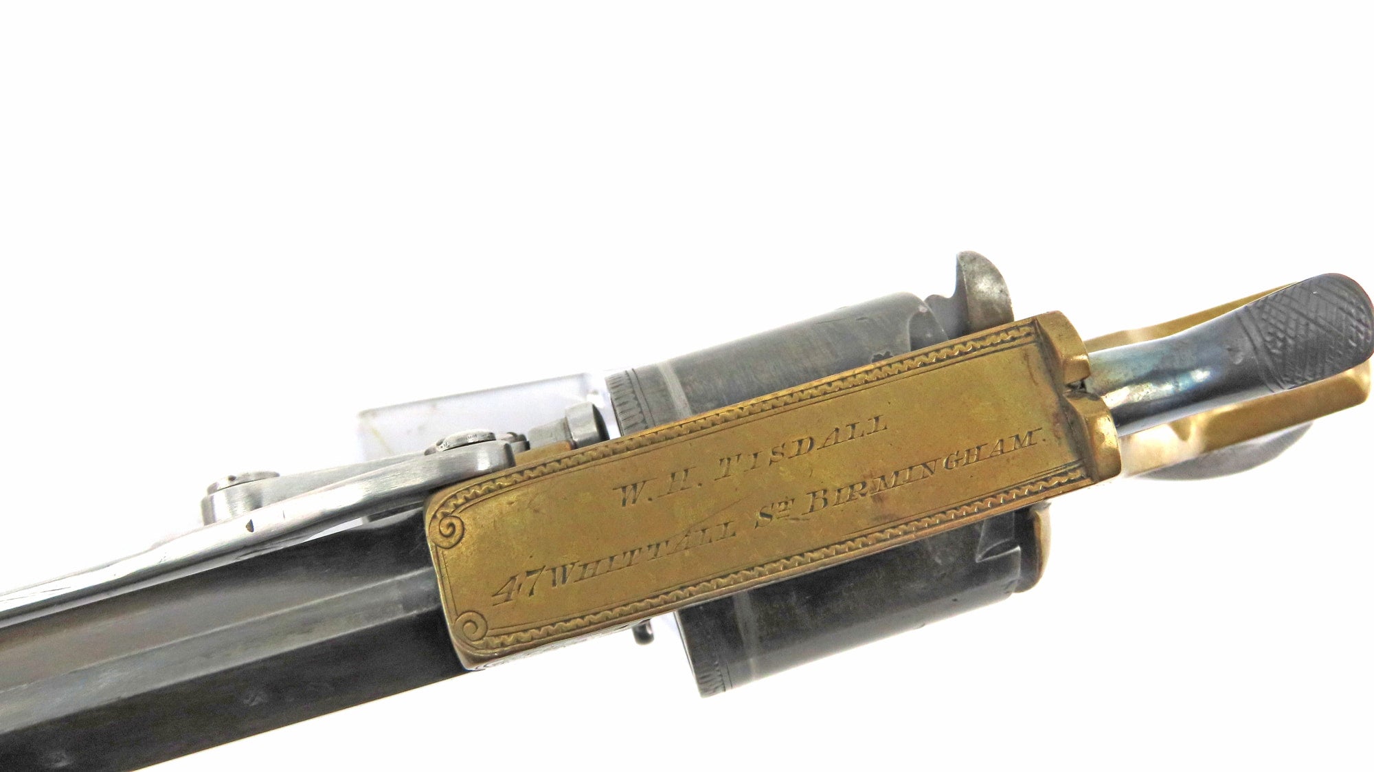 A Fine Tranter .380 Rimfire Bronze Frame House Defence Revolver. 11” overall, 5” octagonal blued barrel, engraved ‘W.H.Tisdall 47 Whittall St Birmingham’ on top strap. 5 shot cylinder with Birmingham proof marks. Gilt bronze solid frame with fine scroll engraving, stamped ‘R&C’ on the frame breast, spur hammer, loading gate & compound leaver ejector to R/H side, two piece chequered walnut grips. Contained in its original blue baize lined oak case, turn screw, cleaning rod & oil bottle, with Manton of Calcutta label in lid