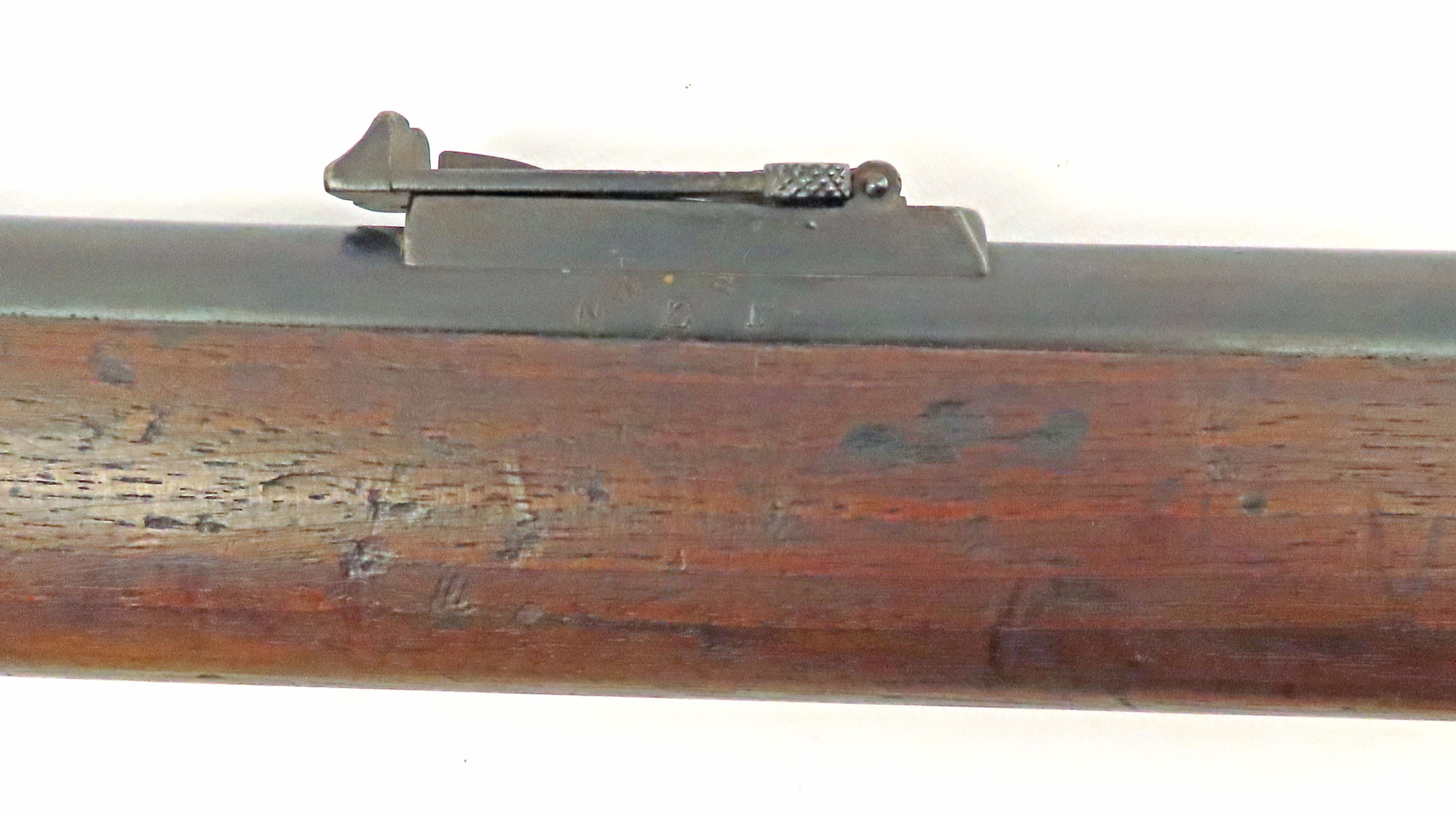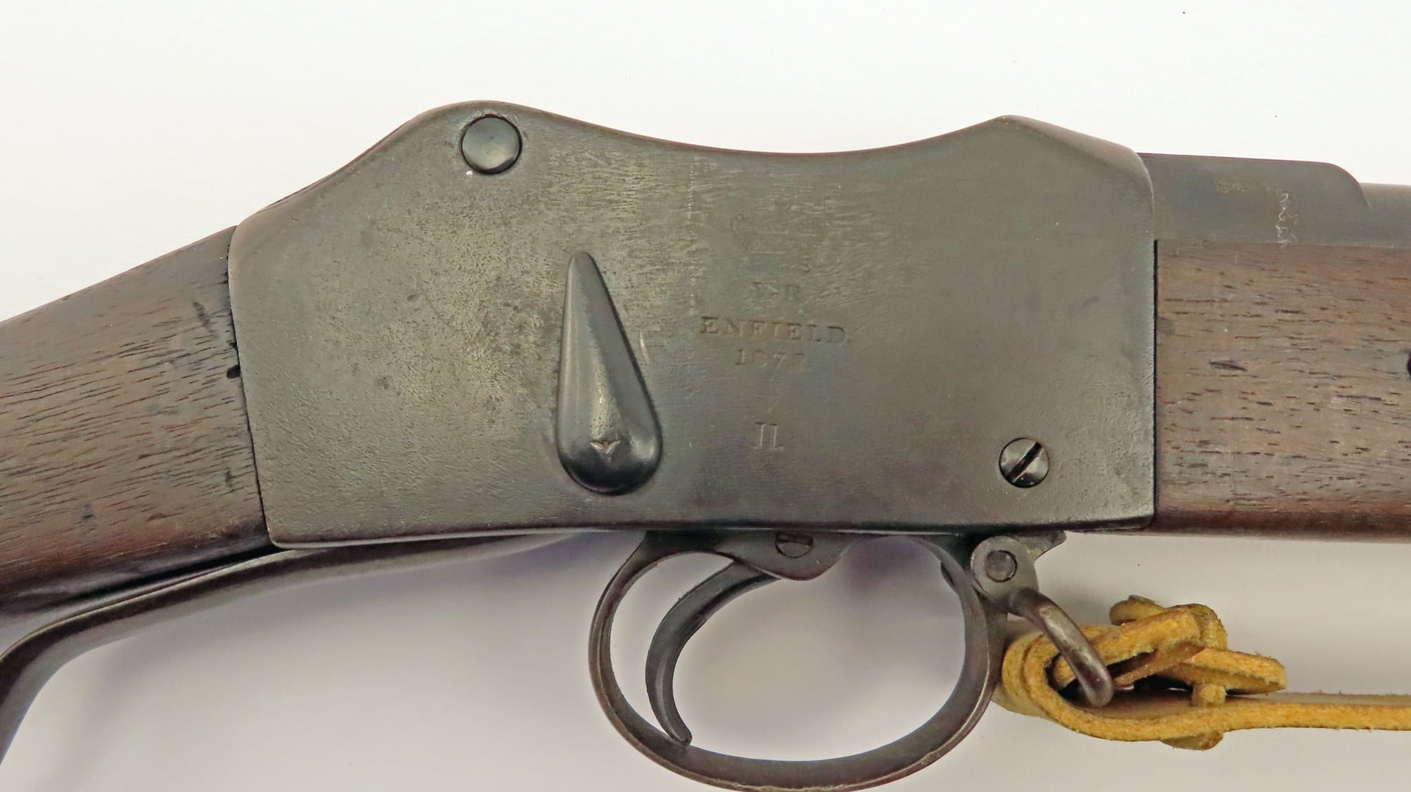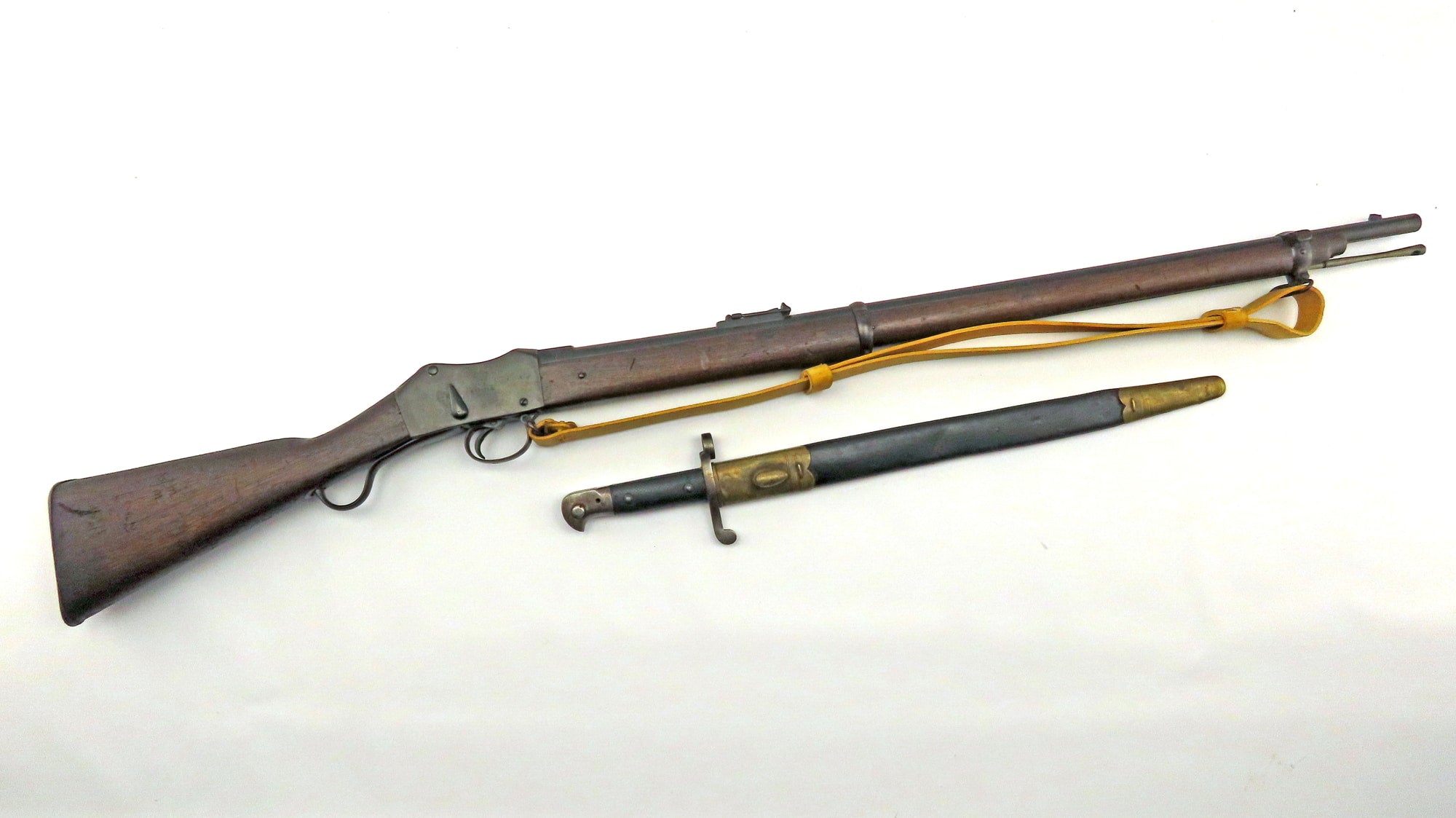 A Fine Martini Henry Mark II Rifle. 49 ½” overall, 32 ½” .577/.450 barrel stamped ‘NS N.E.P’, (Native Service Nepal). Blade foresight, ladder rear sight graduated to 1200 yards. Falling block action, Crown VR, Enfield 1878, II. Large cocking indicator, short lever, steel butt plate & correct cleaning rod, walnut stock with storekeepers’ marks including Enfield roundel with its 1887 Mk 111 sword bayonet by Wilkinson dated 1889. In its brass mounted Indian army scabbard, with a later buff rifle sling.