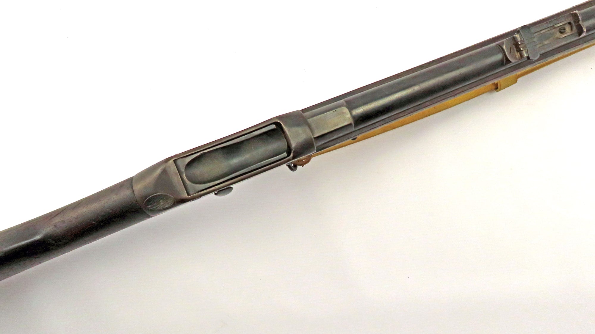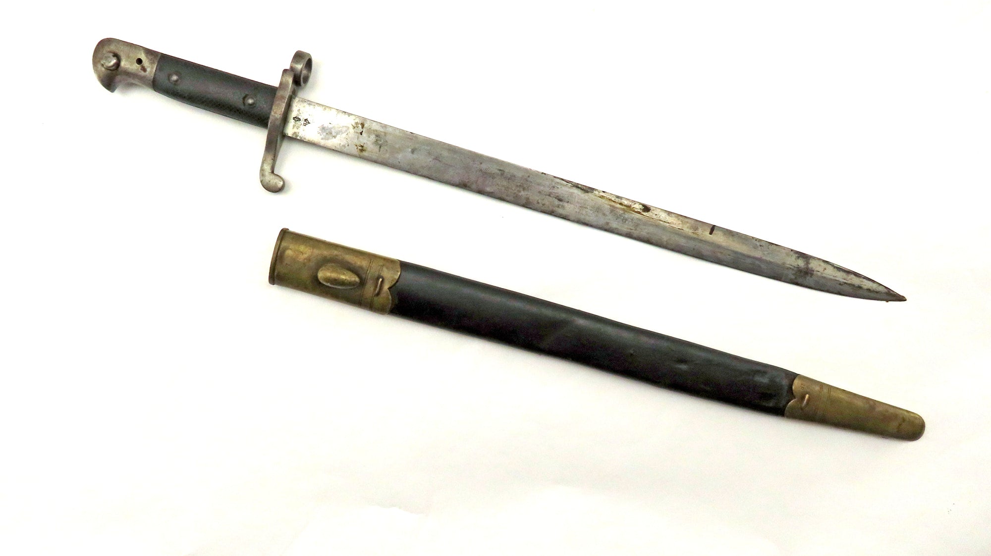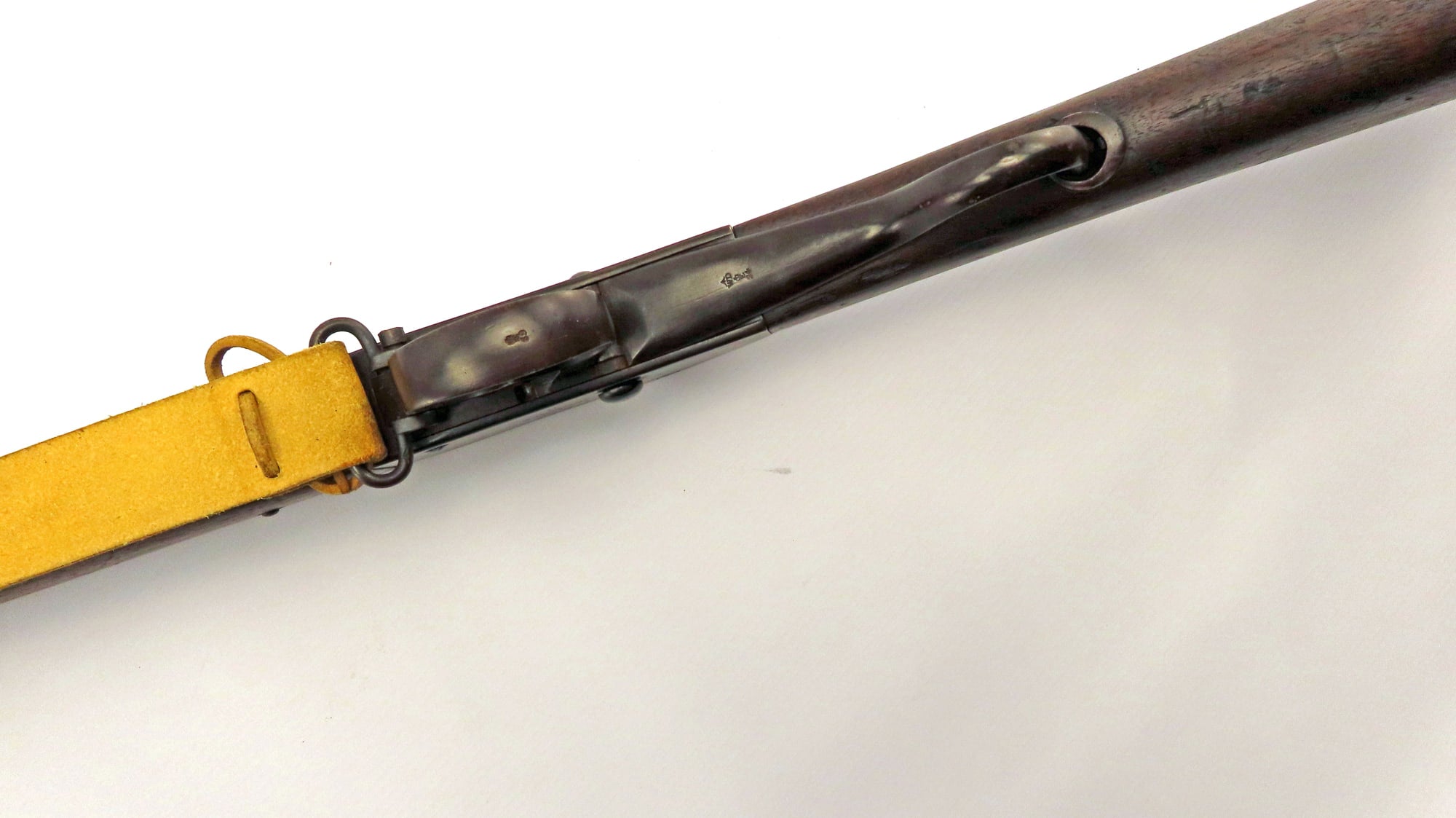 A Fine Martini Henry Mark II Rifle. 49 ½” overall, 32 ½” .577/.450 barrel stamped ‘NS N.E.P’, (Native Service Nepal). Blade foresight, ladder rear sight graduated to 1200 yards. Falling block action, Crown VR, Enfield 1878, II. Large cocking indicator, short lever, steel butt plate & correct cleaning rod, walnut stock with storekeepers’ marks including Enfield roundel with its 1887 Mk 111 sword bayonet by Wilkinson dated 1889. In its brass mounted Indian army scabbard, with a later buff rifle sling.
