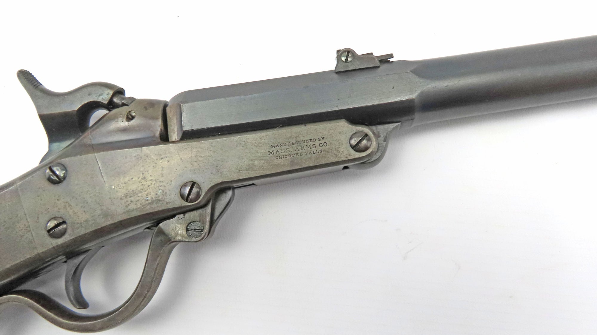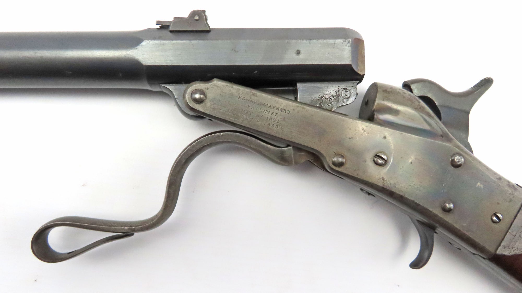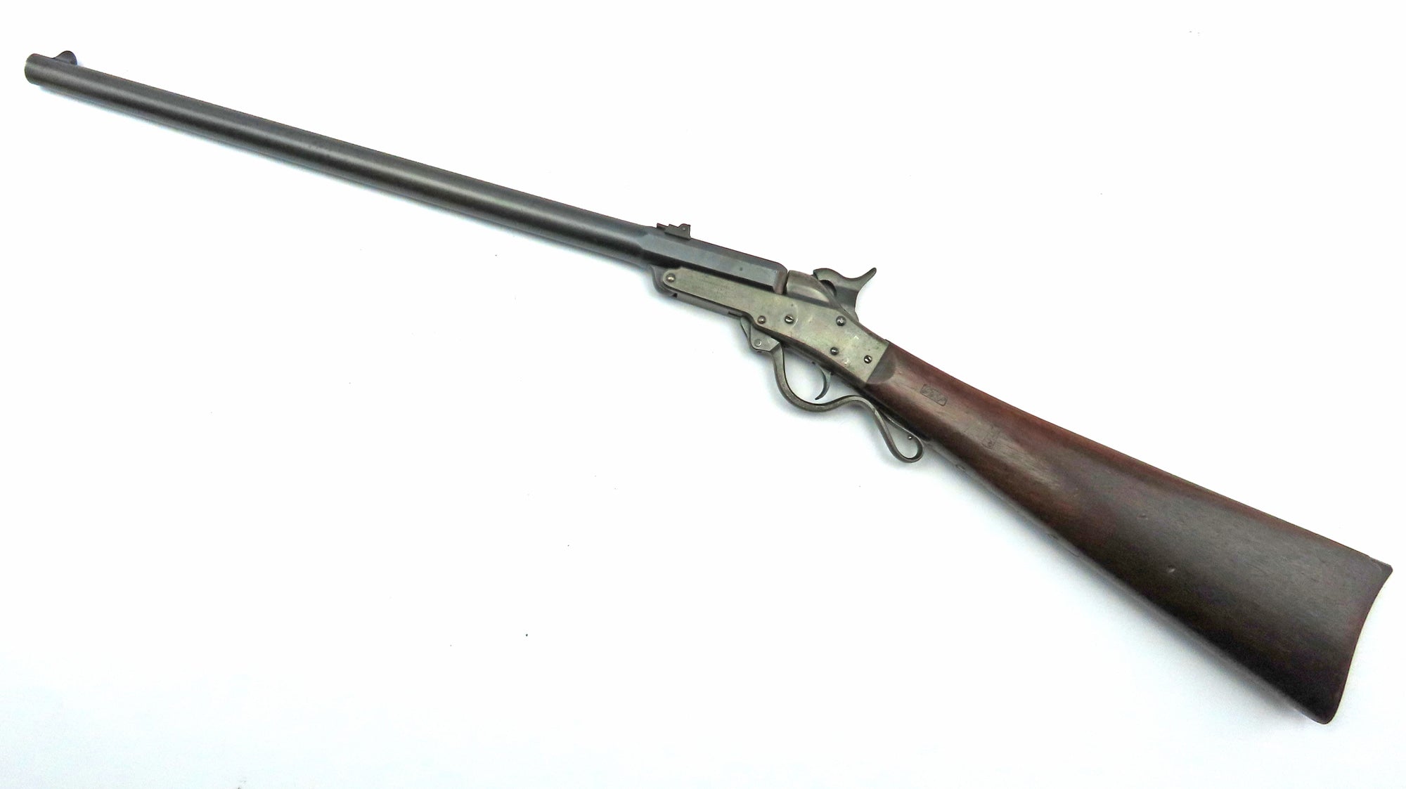 Designed by Dr Edward Maynard, a dentist and inventor of the tape priming system that carries his name. The action is a very simple design and that maybe is why it works so well, it features a barrel that tips down by lowering the lever extension of the trigger-guard and pushing it forward. A reloadable brass cartridge with a wide head is inserted, ignition is by the standard percussion cap and nipple. The system was one of the few to survive and do well on the commercial market after the Civil War. Manufacture was by the Massachusetts Arms Co., although not supplying Maynard carbines to the Government until 1864 they did supply some to Northern states. In the run up to conflict quantities went South, at least 2,500 went to the states of Georgia, Florida and Mississippi. In June 1863 General Ripley signed a contract for the supply of 20,000  Maynard carbines, deliveries were a year late and the first 1000 not received until June 1864 and the final shipment in May 1865. Due to late delivery they were not extensively used. They were issued to the 6th, 9th & 11th Indiana cavalry as well as the 10th and 11th Tennessee.