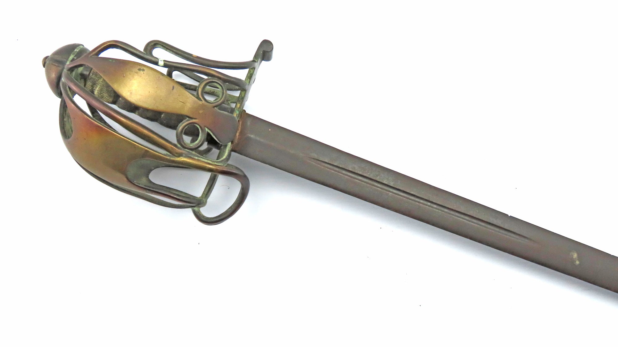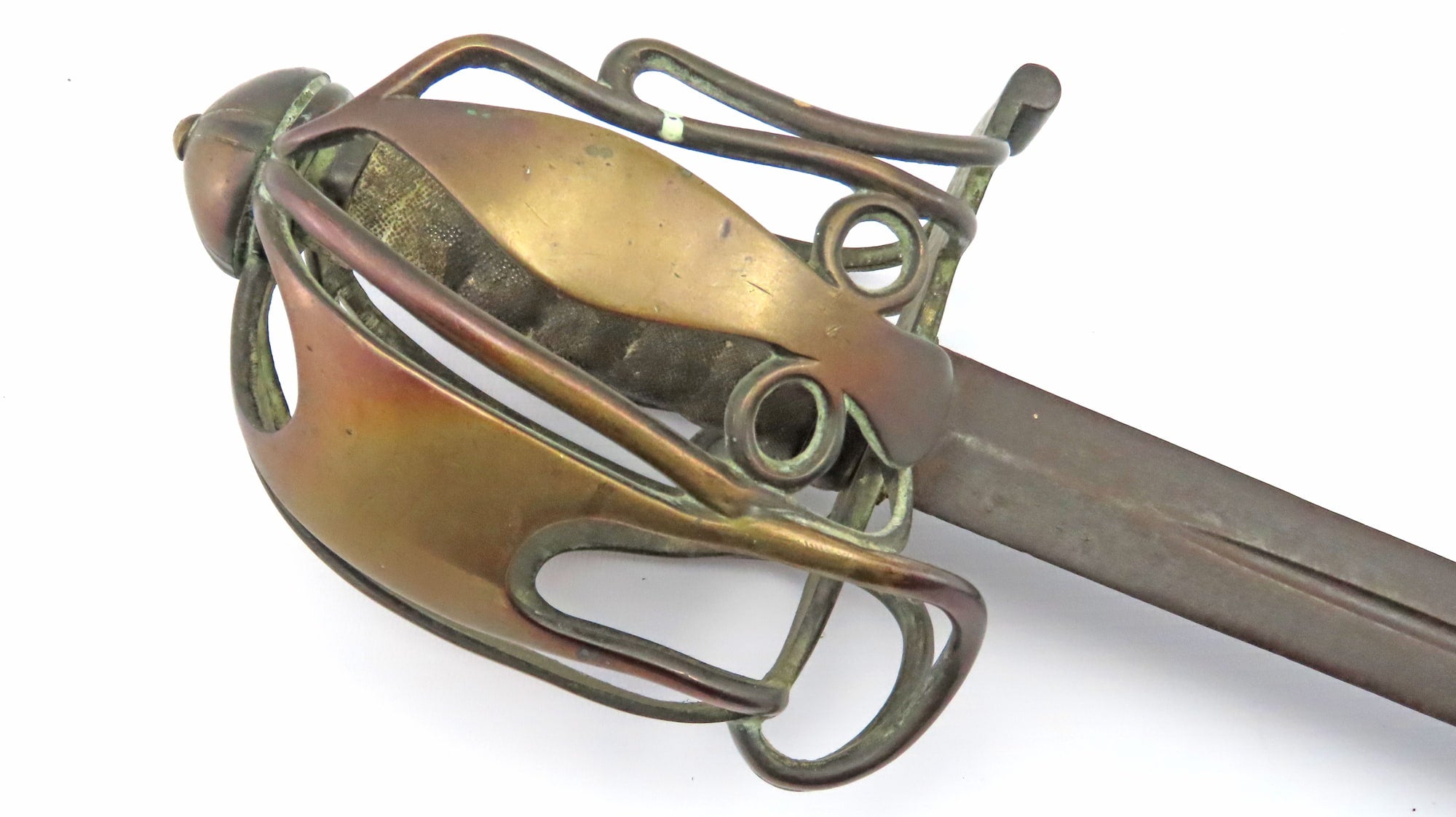 A Rare 1798 Pattern Sergeants Sword to 42nd Foot ‘Black Watch’. 37” overall, 31 ½” double edged blade with narrow central fuller on each face at the forte, brass highland basket hilt of slender rounded bars framing plain panels, slender fore guards, flat wrist guard, bun shaped pommel, spirally grooved fish skin covered grip.
