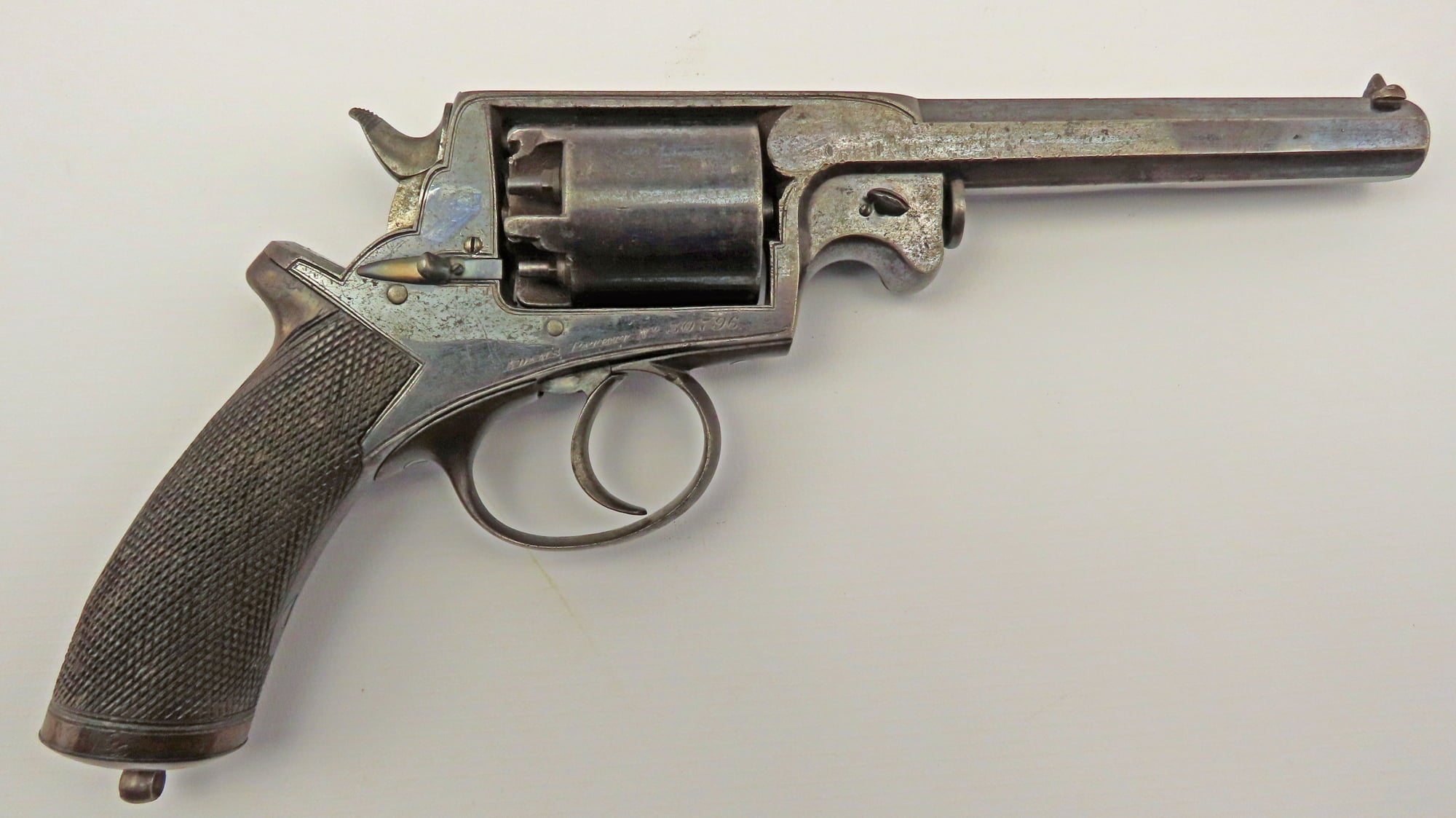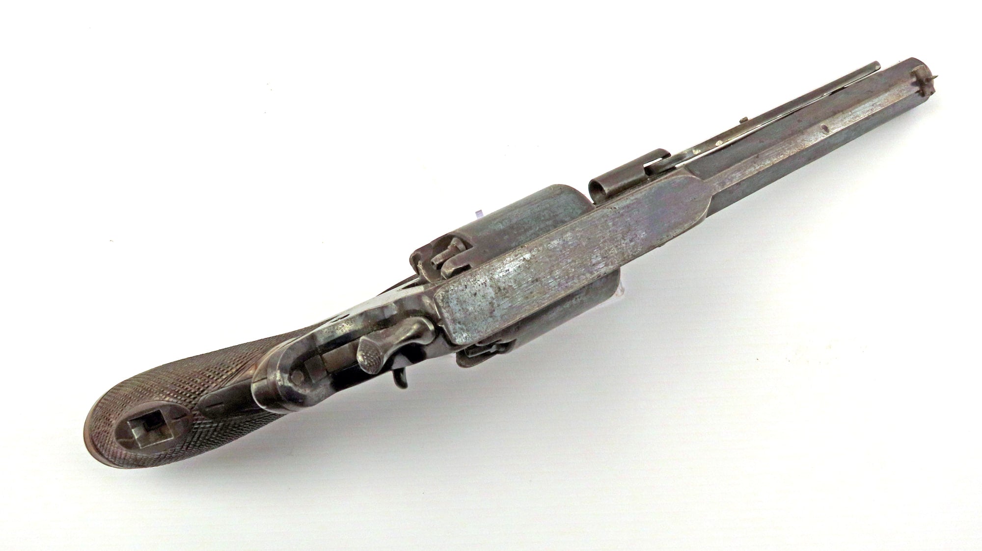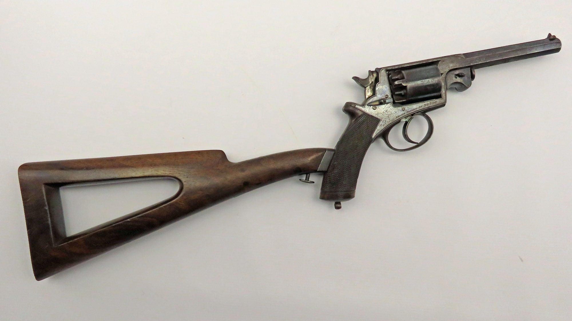 A Very Rare Cased Beaumont Adams 54 Bore Revolver with Shoulder Stock. 24 ½" overall including stock, with blued octagonal sighted barrel fitted with loading lever on the left, border engraved blued frame signed ‘Adams patent’ & numbered 30796 on the right, Birmingham proof marks on blued cylinder No.30796. Chequered walnut butt, blued trigger guard & butt cap, the latter fitted with a pierced eye for a lanyard & skeleton shoulder stock. With finely chequered butt fitted with a knurled press stud & numbered 30796. In its original fitted oak case lined in green baize & complete with some accessories including R. Adams patent, brass bullet mould, powder flask by G & J. W Hawksley & nickel topped glass Young’s oil bottle.