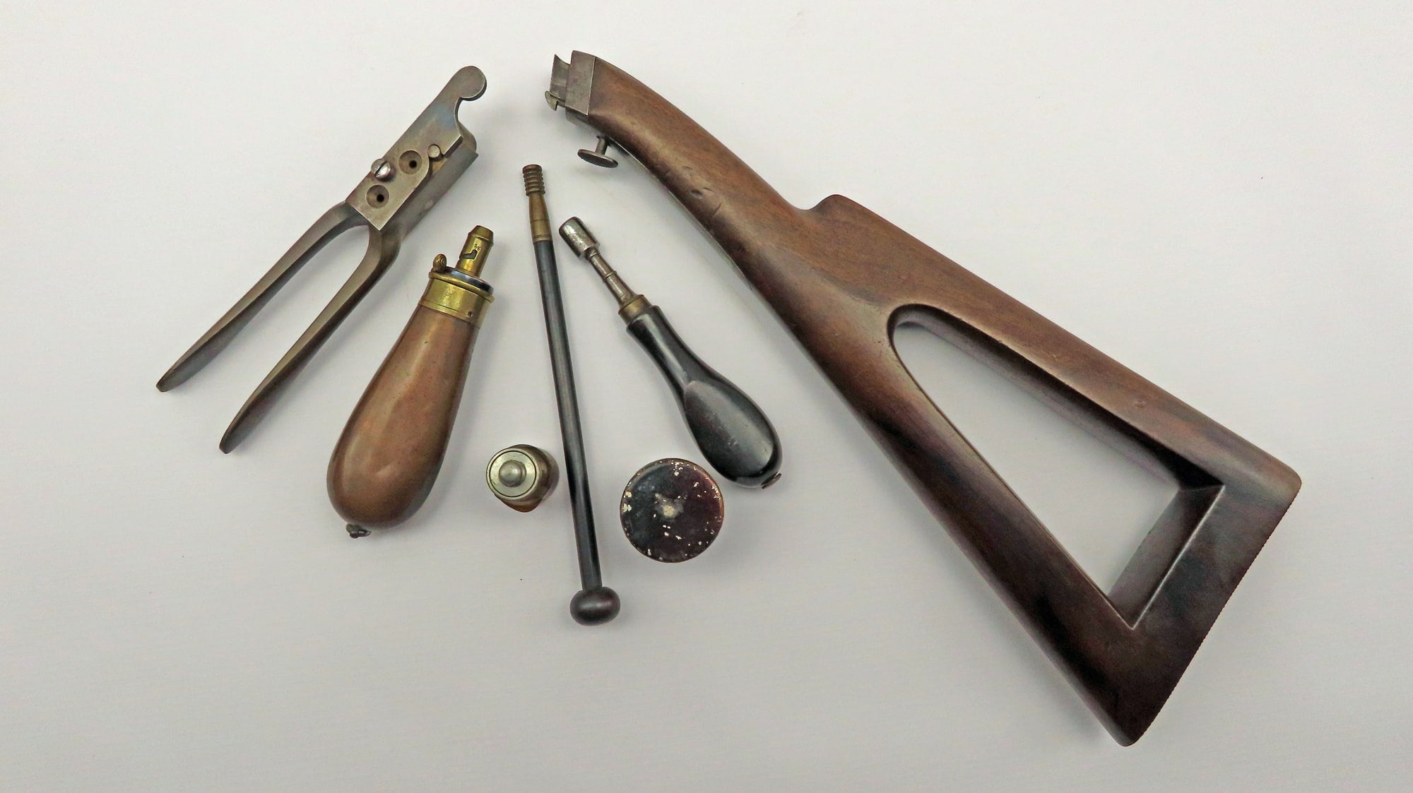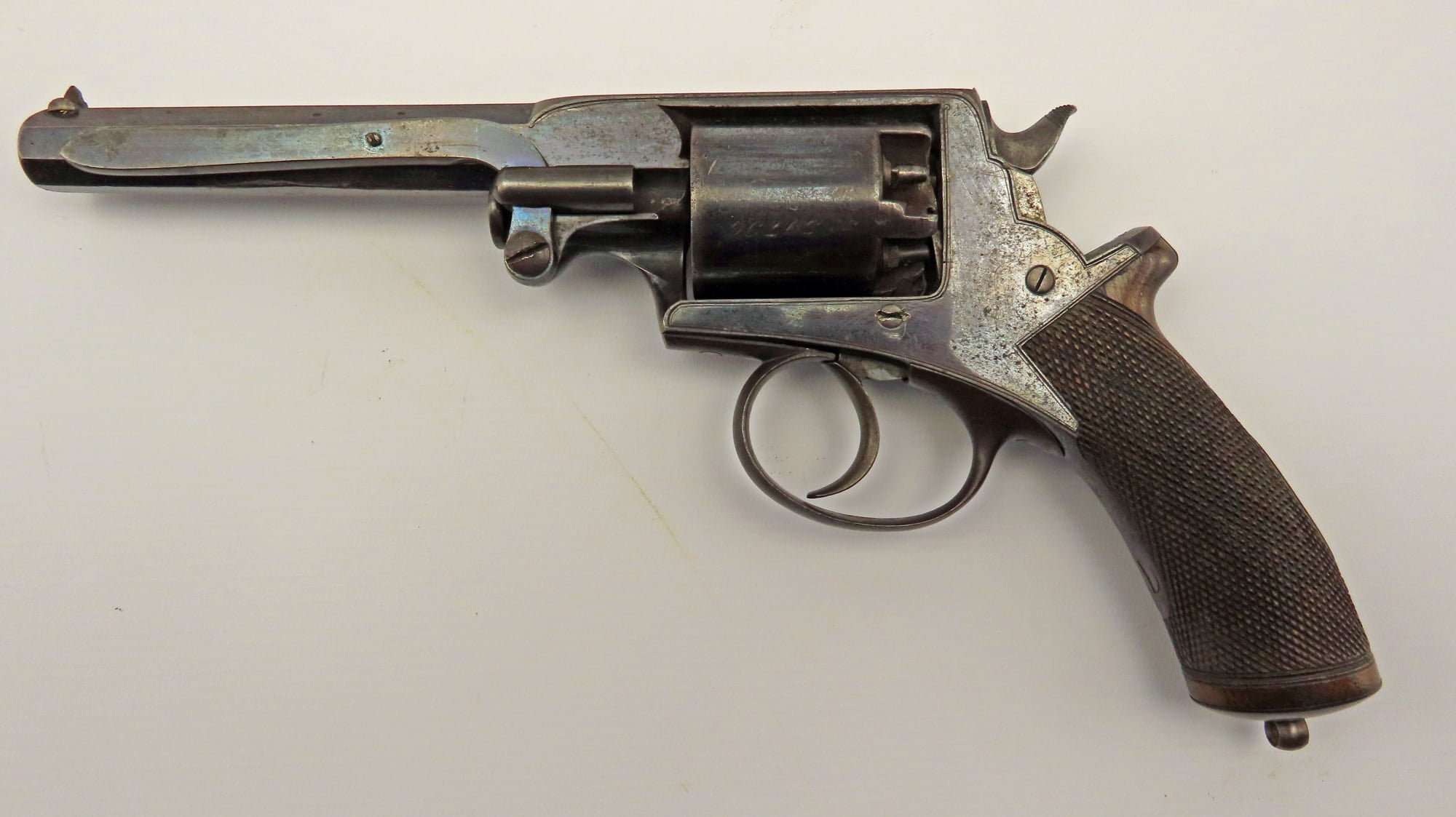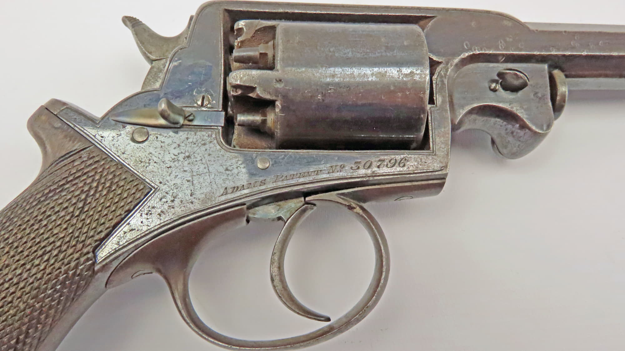 A Very Rare Cased Beaumont Adams 54 Bore Revolver with Shoulder Stock. 24 ½" overall including stock, with blued octagonal sighted barrel fitted with loading lever on the left, border engraved blued frame signed ‘Adams patent’ & numbered 30796 on the right, Birmingham proof marks on blued cylinder No.30796. Chequered walnut butt, blued trigger guard & butt cap, the latter fitted with a pierced eye for a lanyard & skeleton shoulder stock. With finely chequered butt fitted with a knurled press stud & numbered 30796. In its original fitted oak case lined in green baize & complete with some accessories including R. Adams patent, brass bullet mould, powder flask by G & J. W Hawksley & nickel topped glass Young’s oil bottle.
