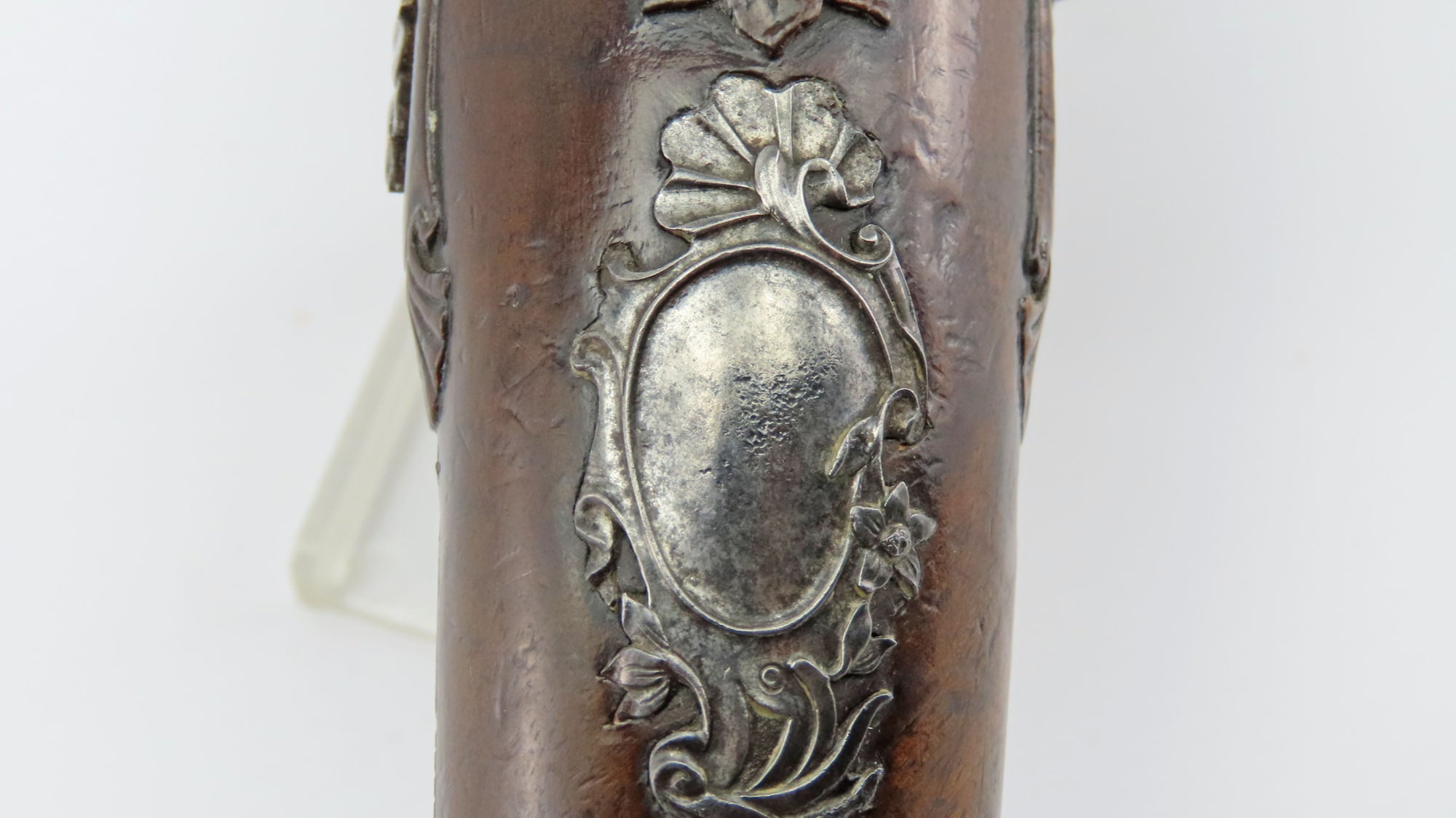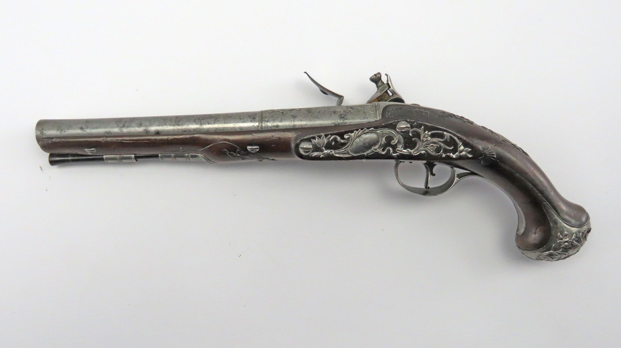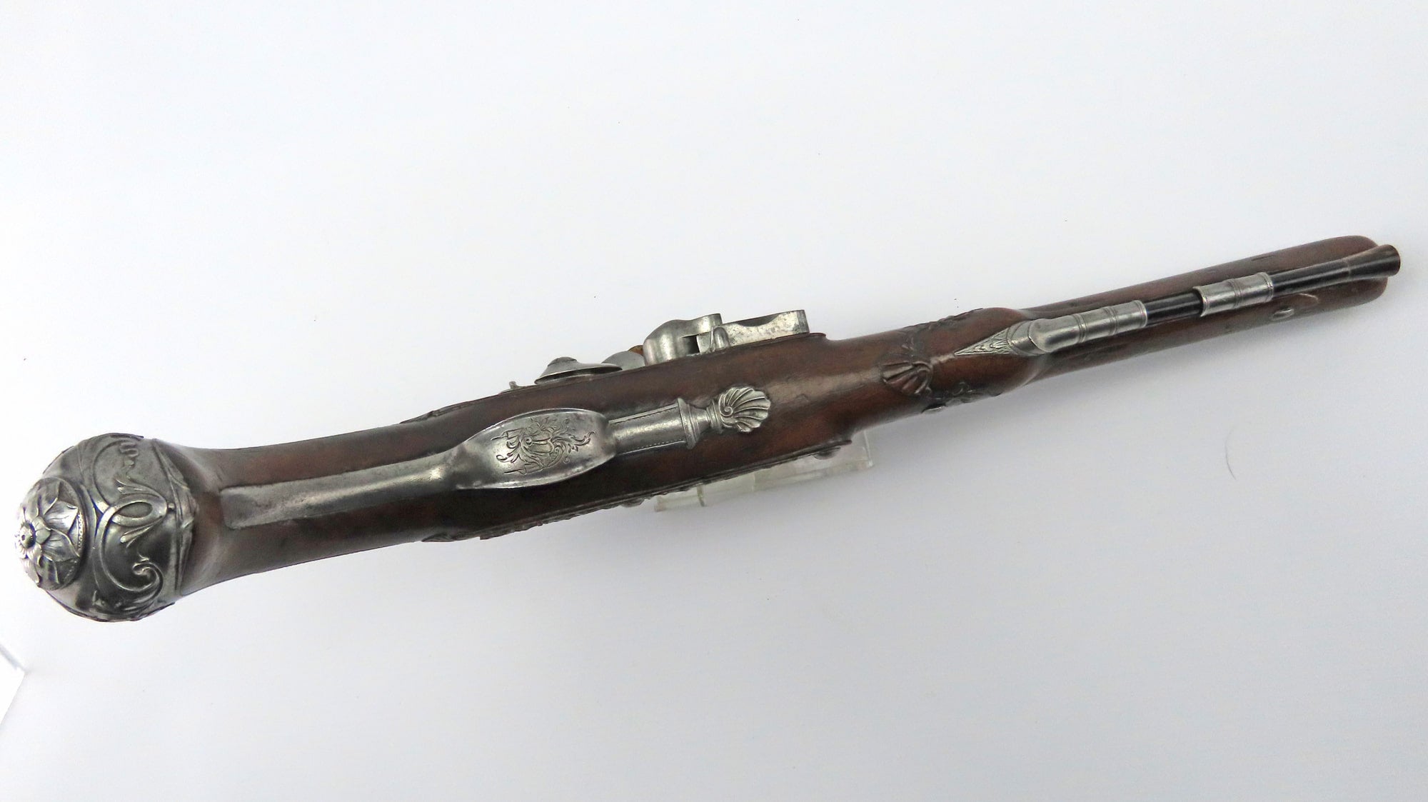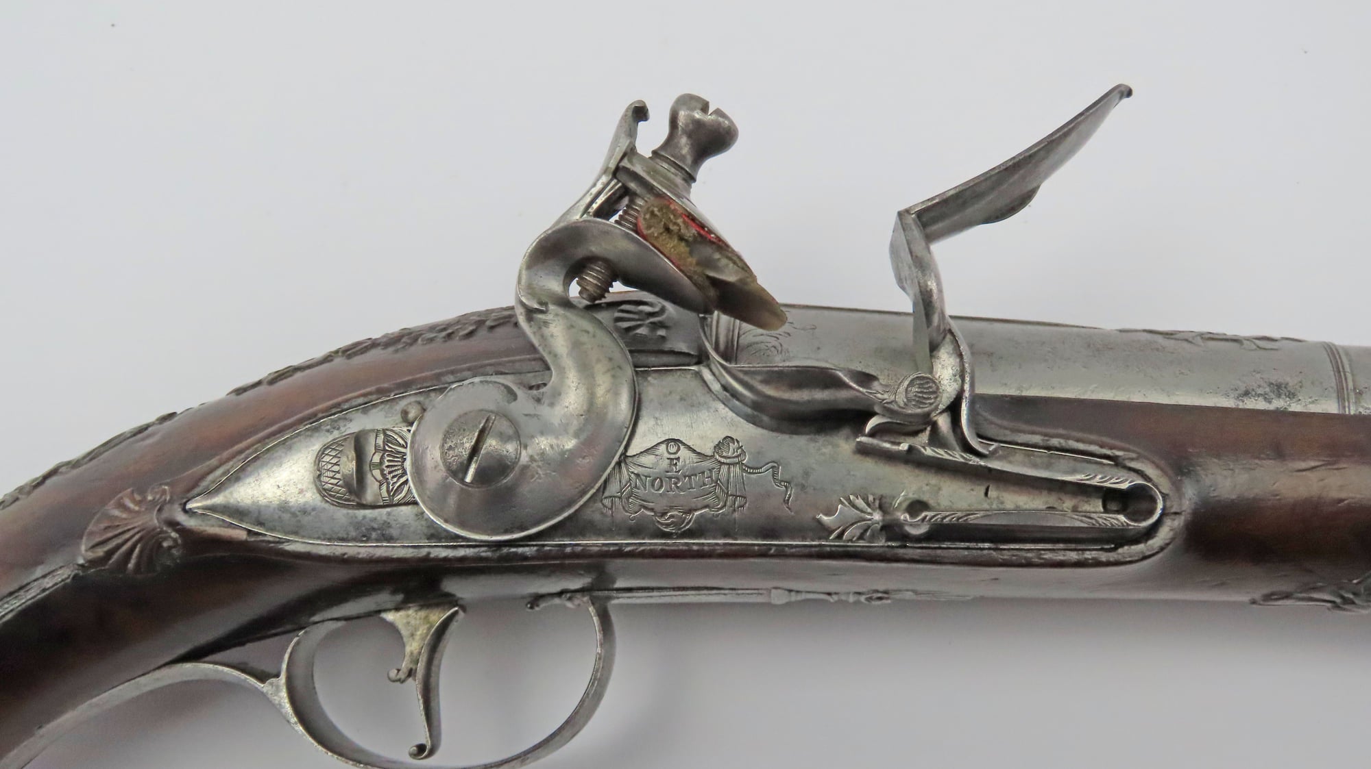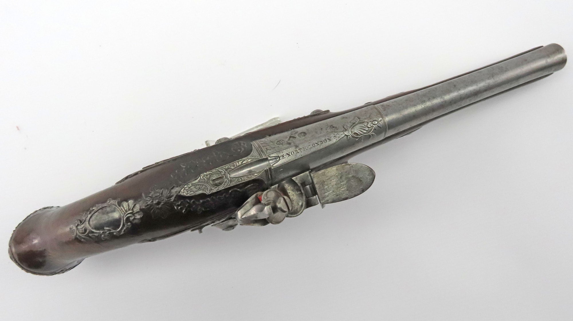 An Exceptional Quality Flintlock Holster Pistol by North. 15 ½” overall, 9 ¼” swamped two-stage 16 bore barrel turned at the girdle, the breech signed ‘E. North’ in capitals along the border engraved top flat & chiselled with a scallop shell & flowering foliage finial, the rear of the breech engraved with acanthus, & struck with London proof marks & barrelsmith’s mark, almost certainly of Edward North, tang grooved for sighting & finely engraved with foliage, rounded lock with slender raised edge signed in capitals ‘E. North’ on gathered drapery, rounded cock & steel with edges en suite, the former with engraved safety-catch behind, the inside of the lockplate stamped ‘RE’, the springs with chiselled details. Figured full stock carved in relief with a scallop shell & foliage around the rear ramrod pipe, a scallop shell behind the tail of the lock & side-flat, and with a flower-head suspended on a garland around each side of the barrel tang, steel mounts finely chiselled in relief and comprising side-plate pierced with flowering foliage centred on a cartouche, vacant escutcheon en suite and surmounted by a scallop shell, pommel with engraved spurs and decorated with swept foliage incorporating a flower-head on both sides, and border engraved cap with a large flowerhead, trigger guard with scallop shell finial & engraved with a rocaille & foliage on the bow, turned ramrod pipes, and later horn tipped ramrod