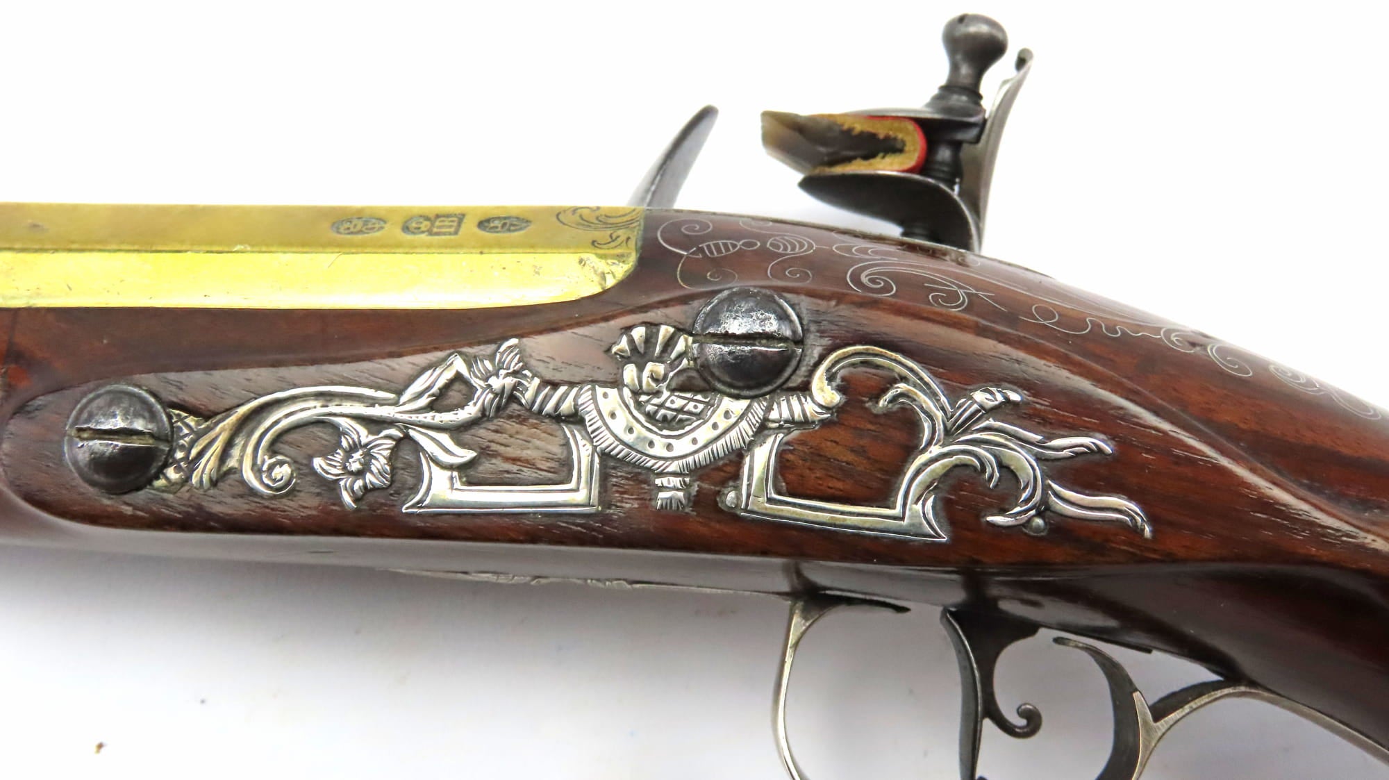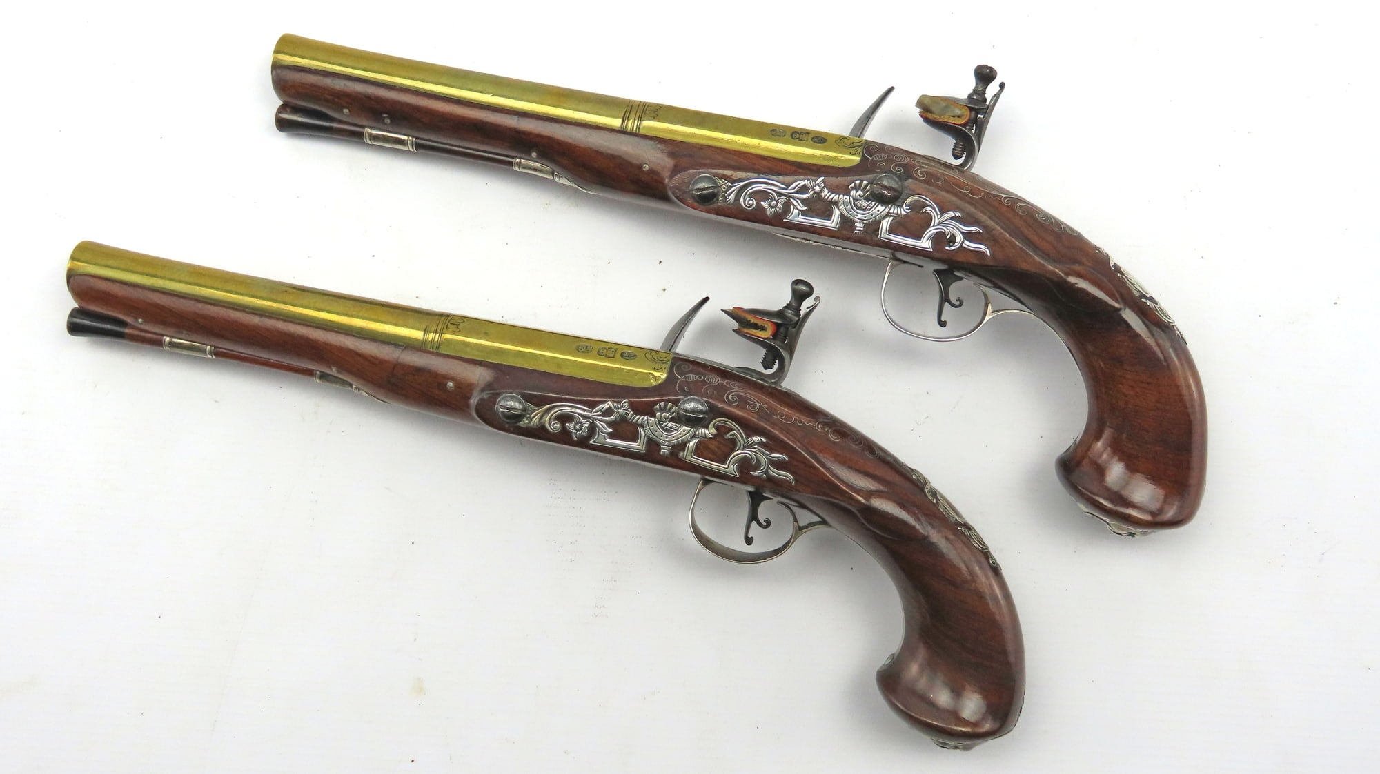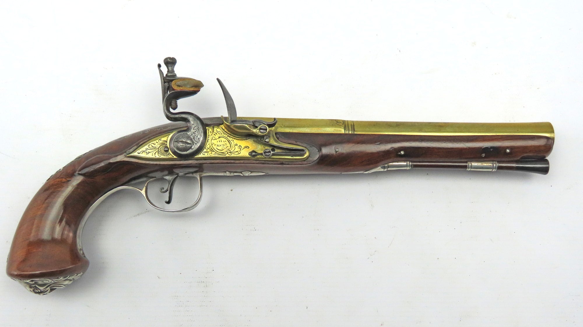 A Fine Pair of Flintlock Silver Mounted Holster Pistols by W Turvey. 14” overall, 8 ¼” swamped copper alloy barrels each turned & engraved with acanthus at the girdle, engraved ‘HOLBORN LONDON’ along the top flat in front of scrolling foliage, struck with London proof marks & unidentified barrelsmith’s mark, ‘IB’ crowned, border engraved tangs each decorated with foliate scrolls. Border engraved flat bevelled copper alloy locks each signed ‘Turvey’ in capitals within rocailles & foliage, a scallop shell and foliage on each tail, cocks engraved with foliage en suite. Moulded figured full stocks each with rounded flared butt & inlaid with a silver wire scallop shell & scrollwork around the barrel tang, cast & chased mounts comprising side plates each pierced with foliage centred on a scallop shell resting on a draped pedestal, vacant trophy of arms escutcheons, grotesque mask caps, trigger guards each with acorn finial & engraved with a flower head on the bow. Triggers each with a scroll at the back, turned ramrod pipes, horn tipped ramrods, probably original, one with iron worm.