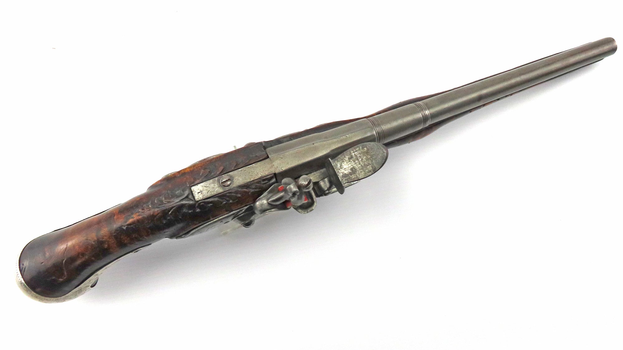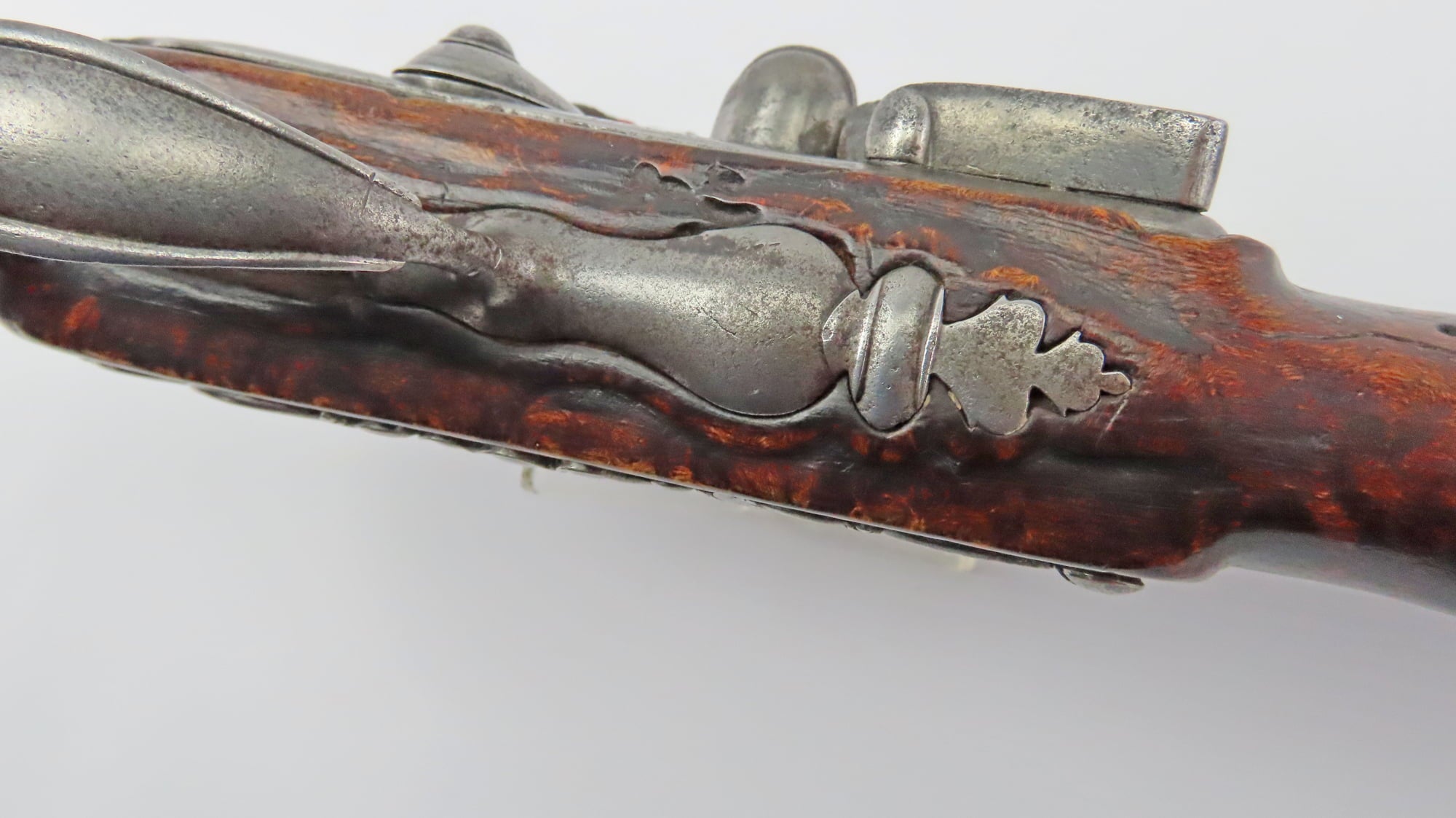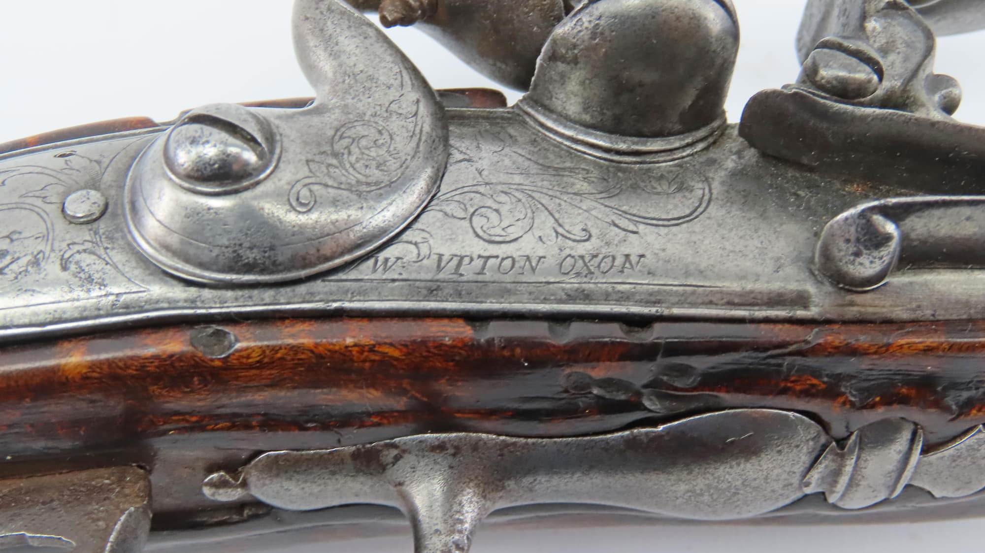 A Very Rare 17th Century Flintlock Holster Pistol by W. Upton of Oxford. 18 ¾” overall, 11 ½” tapering three-stage, octagonal becoming polygonal & struck with a fleur-de-lys mark beneath, tang with traces of foliate engraving, border engraved rounded lock with narrow raised edge, signed ‘W. Upton Oxon’ and decorated with scrolling foliage beneath the pan, monster head terminal on the tail, foliate engraved cock, moulded figured walnut rootwood full stock carved in low relief. Mounts comprising pierced & chiselled iron sideplate with monster-head terminals, border engraved spurred silver pommel retained by a screw with fluted head centred on an engraved flower-head, iron trigger guard with shaped finial, scrolled trigger, turned silver ramrod pipes, later horn-tipped ramrod.