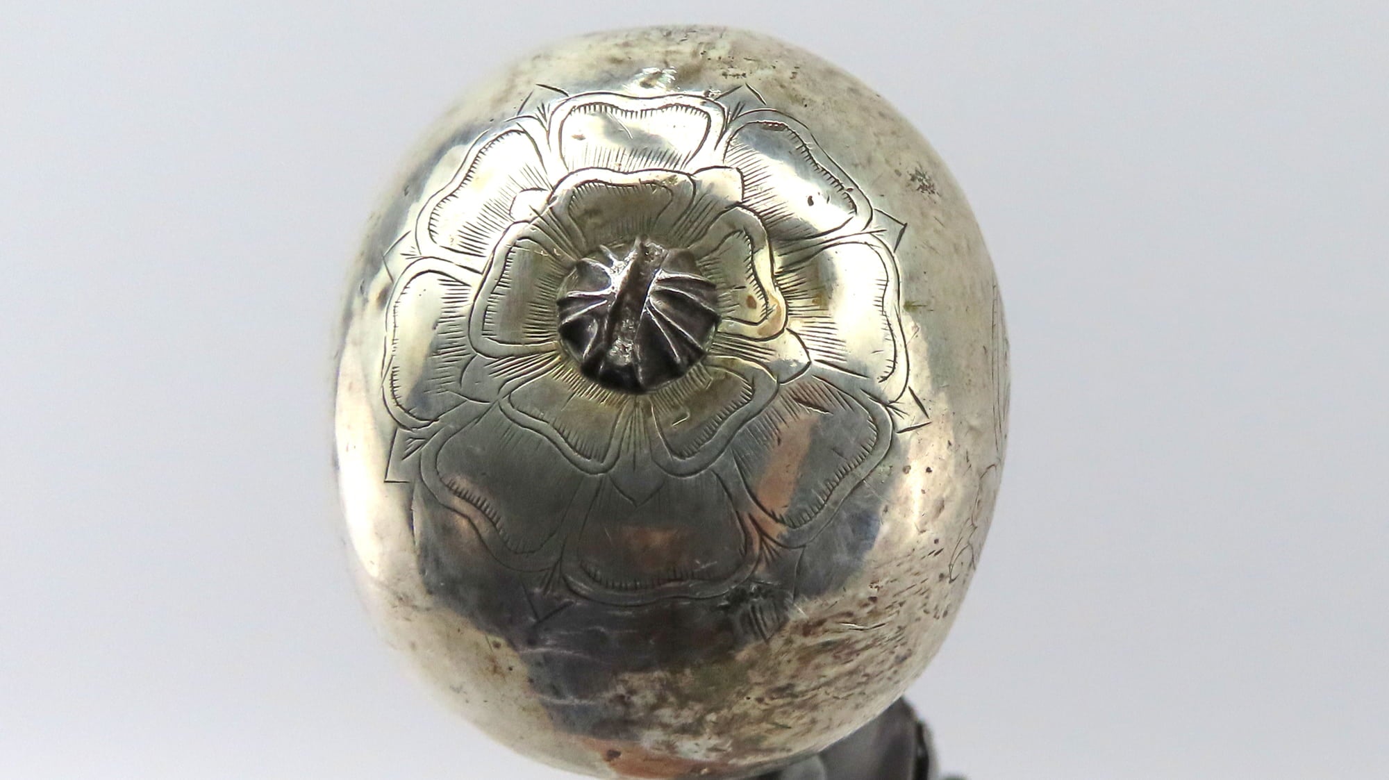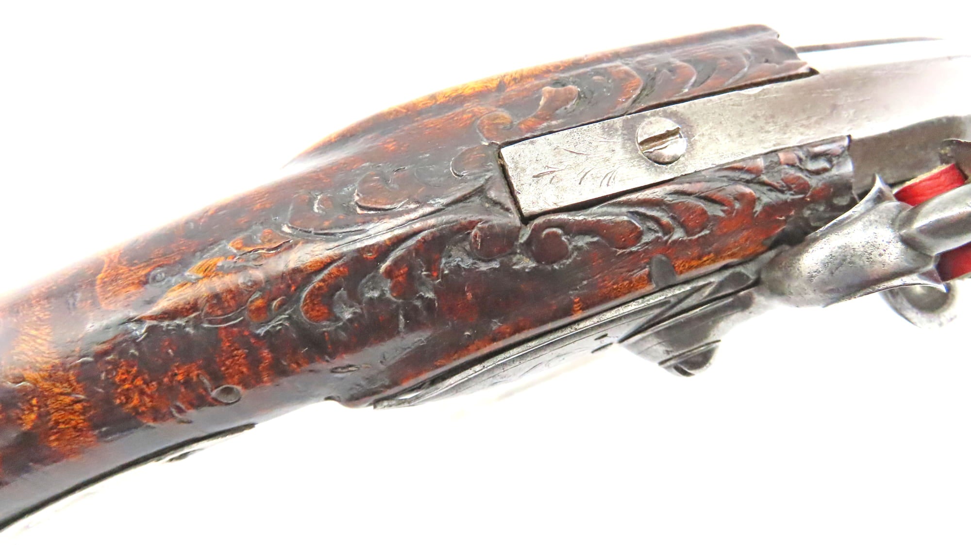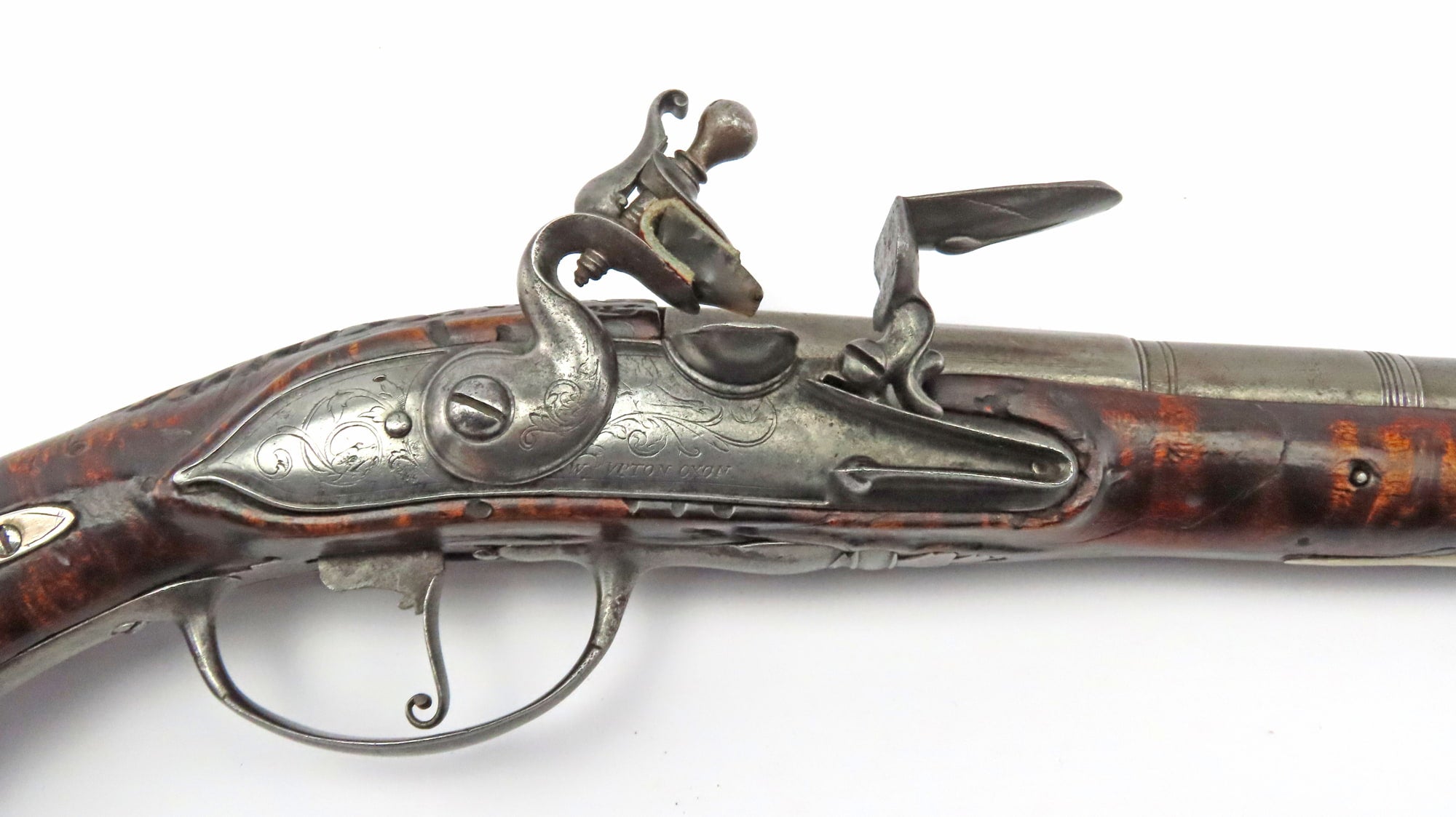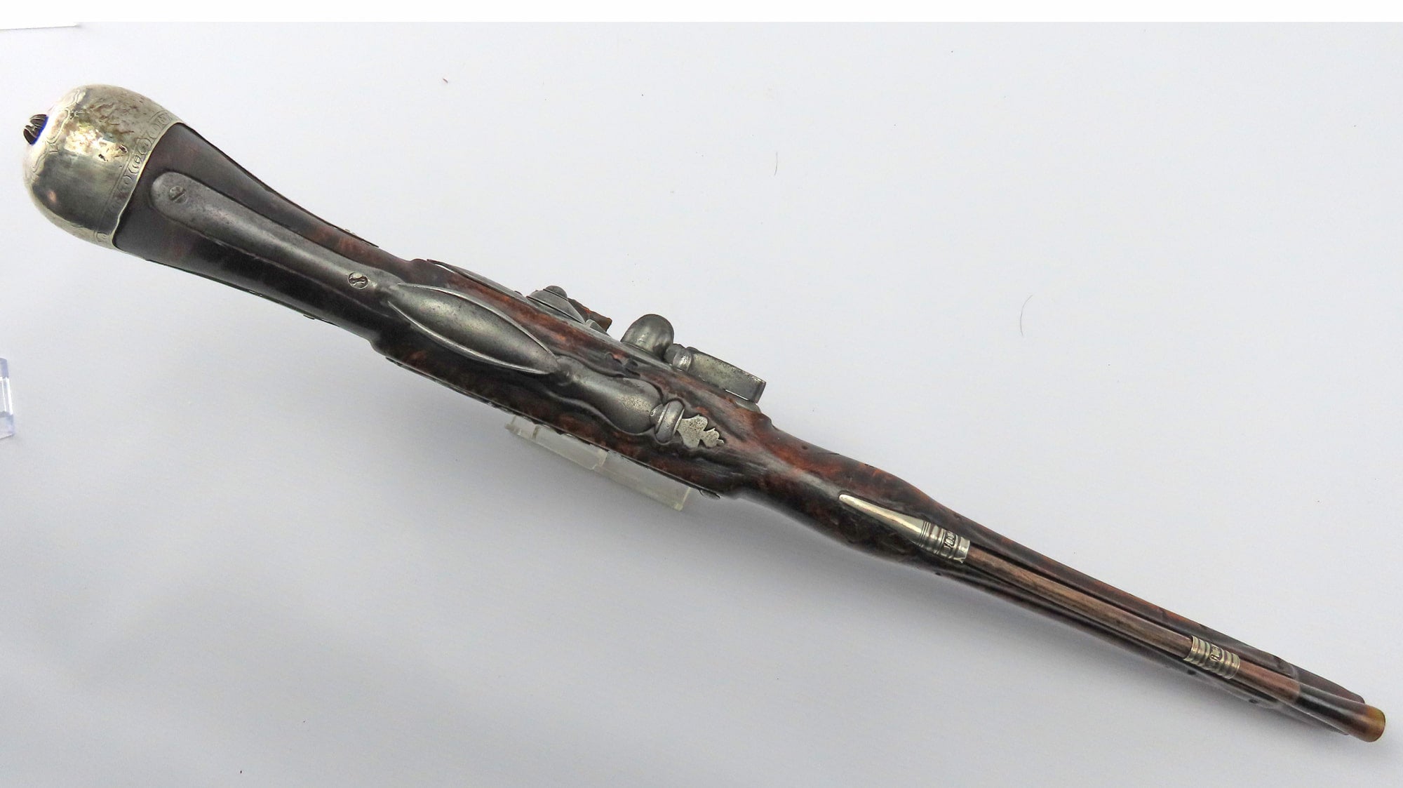 A Very Rare 17th Century Flintlock Holster Pistol by W. Upton of Oxford. 18 ¾” overall, 11 ½” tapering three-stage, octagonal becoming polygonal & struck with a fleur-de-lys mark beneath, tang with traces of foliate engraving, border engraved rounded lock with narrow raised edge, signed ‘W. Upton Oxon’ and decorated with scrolling foliage beneath the pan, monster head terminal on the tail, foliate engraved cock, moulded figured walnut rootwood full stock carved in low relief. Mounts comprising pierced & chiselled iron sideplate with monster-head terminals, border engraved spurred silver pommel retained by a screw with fluted head centred on an engraved flower-head, iron trigger guard with shaped finial, scrolled trigger, turned silver ramrod pipes, later horn-tipped ramrod.