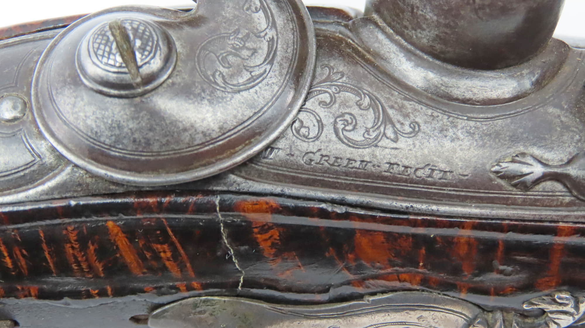 A Very Fine & Rare 17th Century Flintlock Holster Pistol with Silver Mounts by T. Green of London. 16 ½” overall, 9” two stage barrel engraved with foliage in front of the turned girdle, border engraved breech signed ‘GREEN’ in capitals along the top of a raised panel with chiselled trefoil terminal & decorated with foliate scrolls, a chiselled band of acanthus at the rear, struck with London proof marks & barrel smith’s mark of Thomas ‘1’ Green, tang, border engraved rounded lock signed ‘T.GREEN FECIT’ in capitals & finely decorated with scrolling foliage, the foliage on the tail with male profile head terminal wearing a winged cap, rounded cock and steel decorated en suite. Figured moulded Walnut rootwood full stock inlaid with silver wire scrollwork on either side of the characteristic swelling at the rear ramrod pipe & along the back of the butt, the latter highlighted with two engraved silver flower heads & silver dots, Silver cast & chased mounts comprising pierced foliate scroll sideplate with monster head terminal, vacant foliate escutcheon surmounted by a demi-lion mask, pommel with engraved spurs & decorated with a design of symmetrical foliage on both sides within double lined borders & a satyr mask cap centred on a border of acanthus, Hall Marked Silver trigger guard with pierced foliate finial & decorated with a hound’s head & foliage on the border engraved bow, baluster ramrod pipes, later silver capped wooden ramrod.