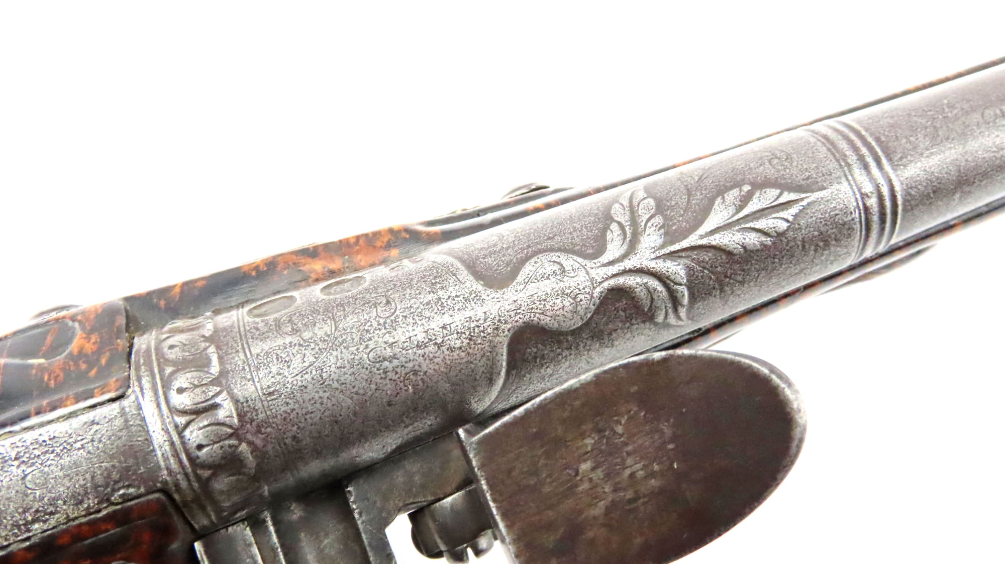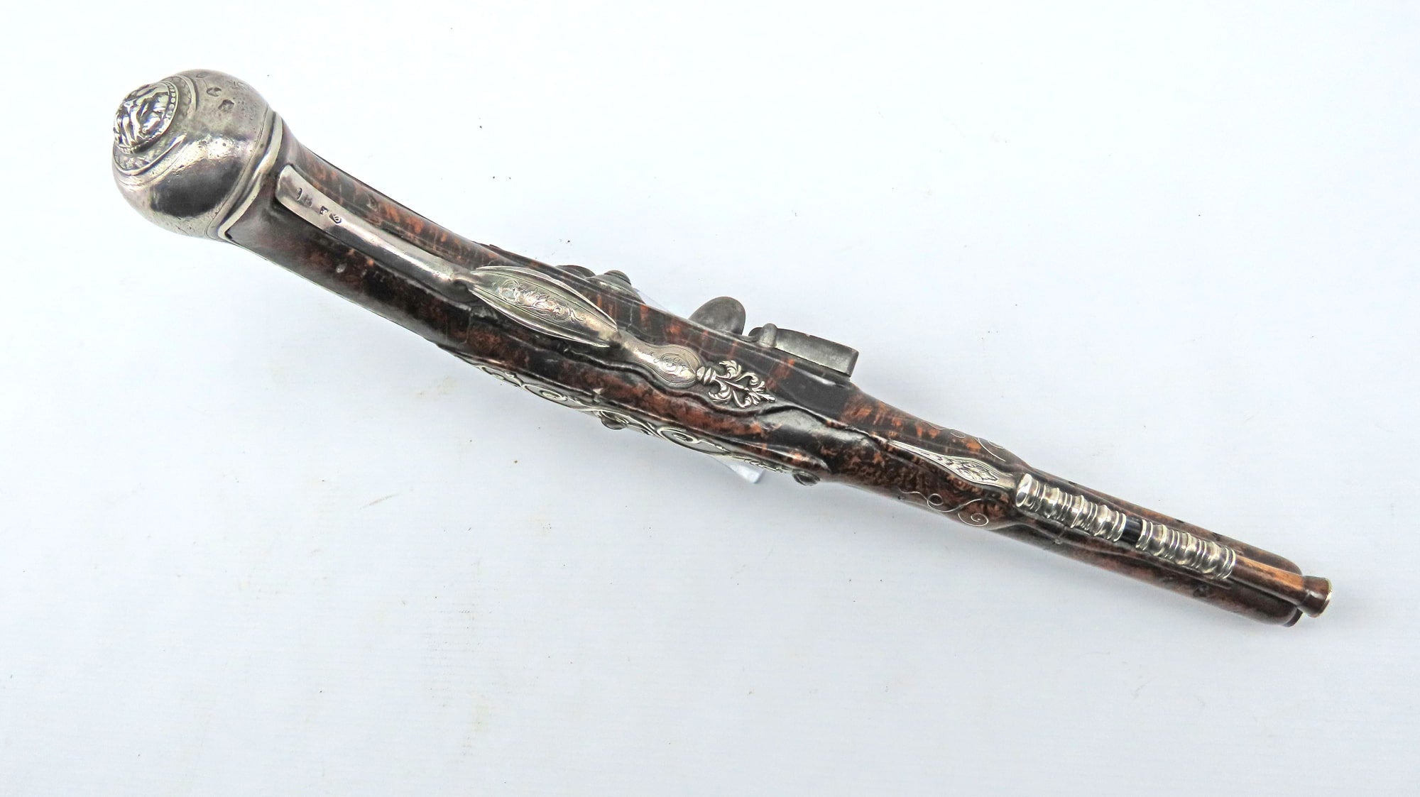 Britannia Silver Hall Mark for 1699, this pistol is believed to be the earliest hallmarked English Pistol. Silversmith’s mark of William Bull
