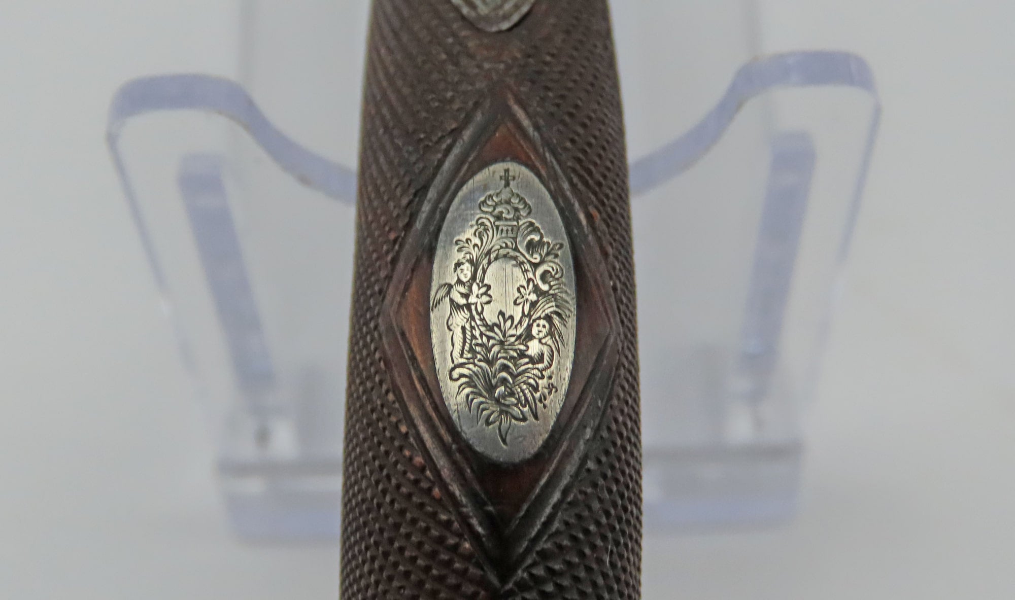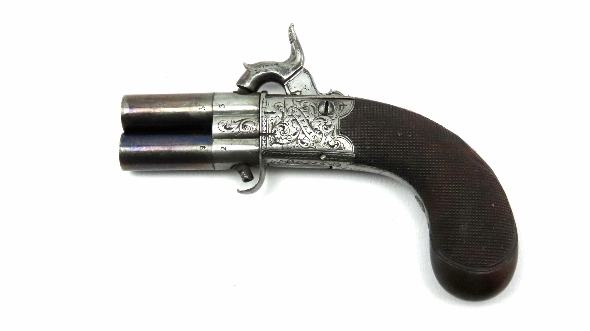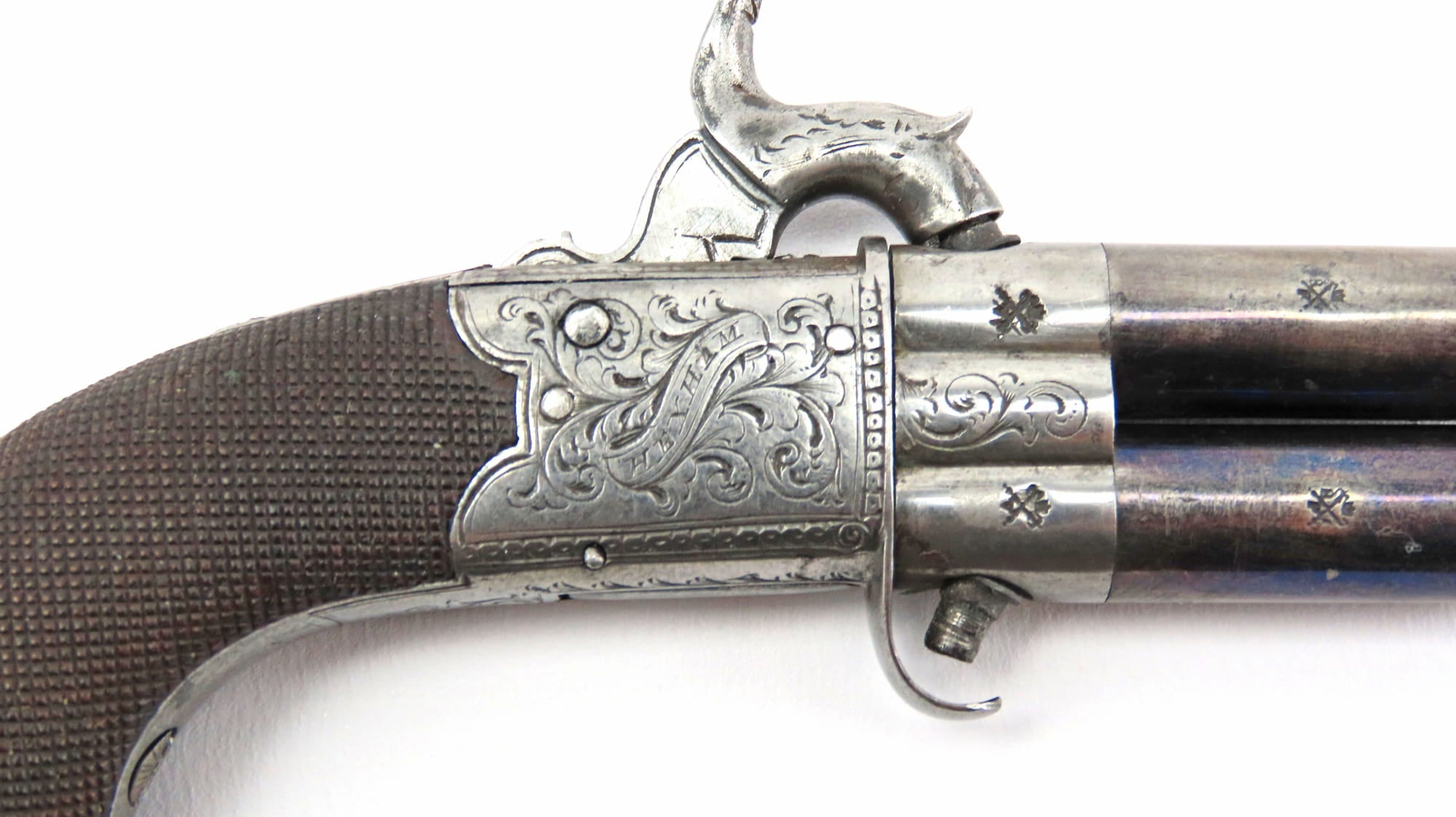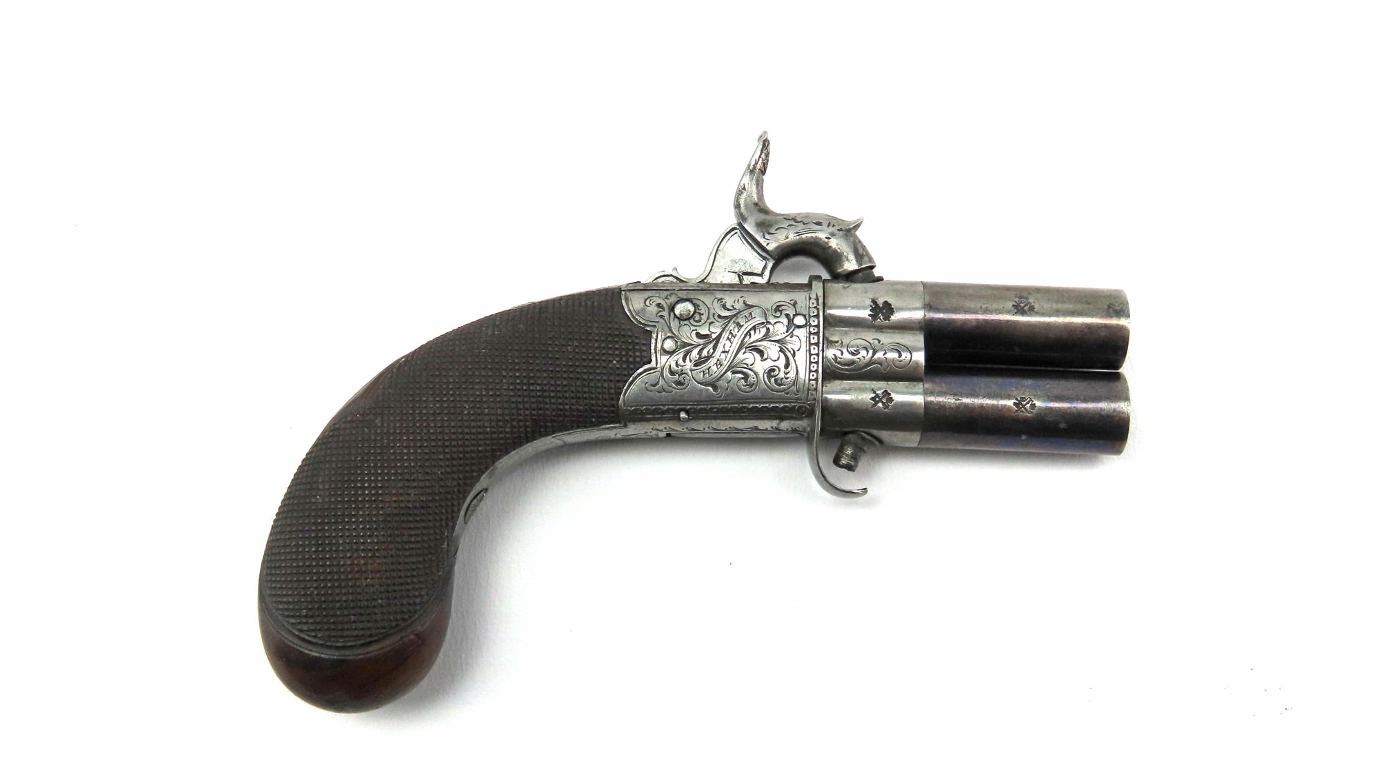 A Tiny Percussion Turn Over Muff Pistol. 4” overall, 1” blued turn off 150 bore barrels, struck with Birmingham proofs, foliate engraved breech decorated with scrolling foliage & stamped with Birmingham proofs & numbered ‘2’ & ‘3’ foliate engraved box-lock action signed ‘WALLAS’ on a scroll to the left & ‘HEXHAM’ on a scroll to the right, fitted with a flip down trigger, chequered walnut butt with engraved oval escutcheon.