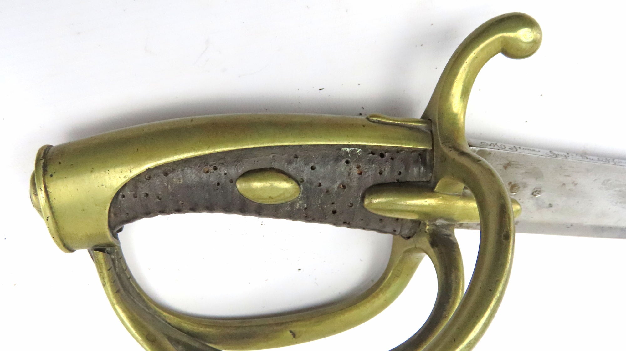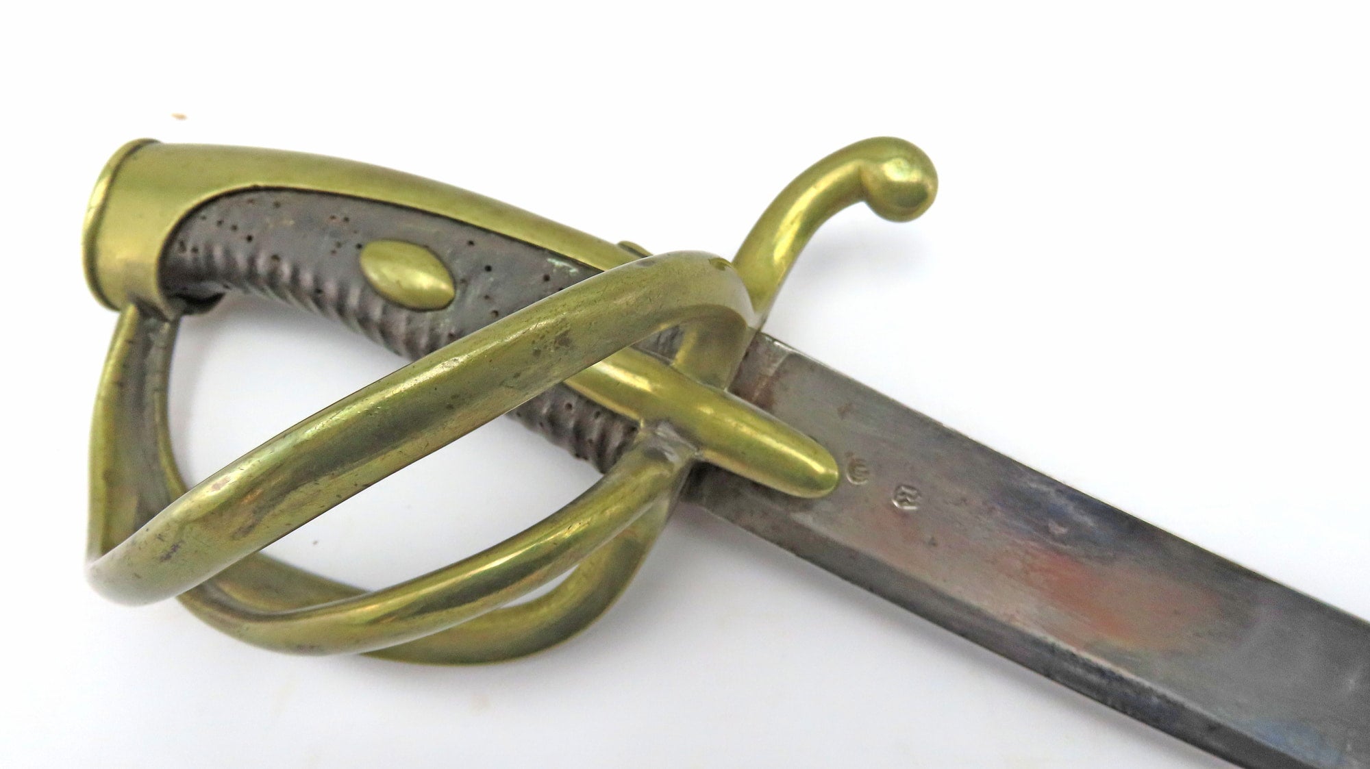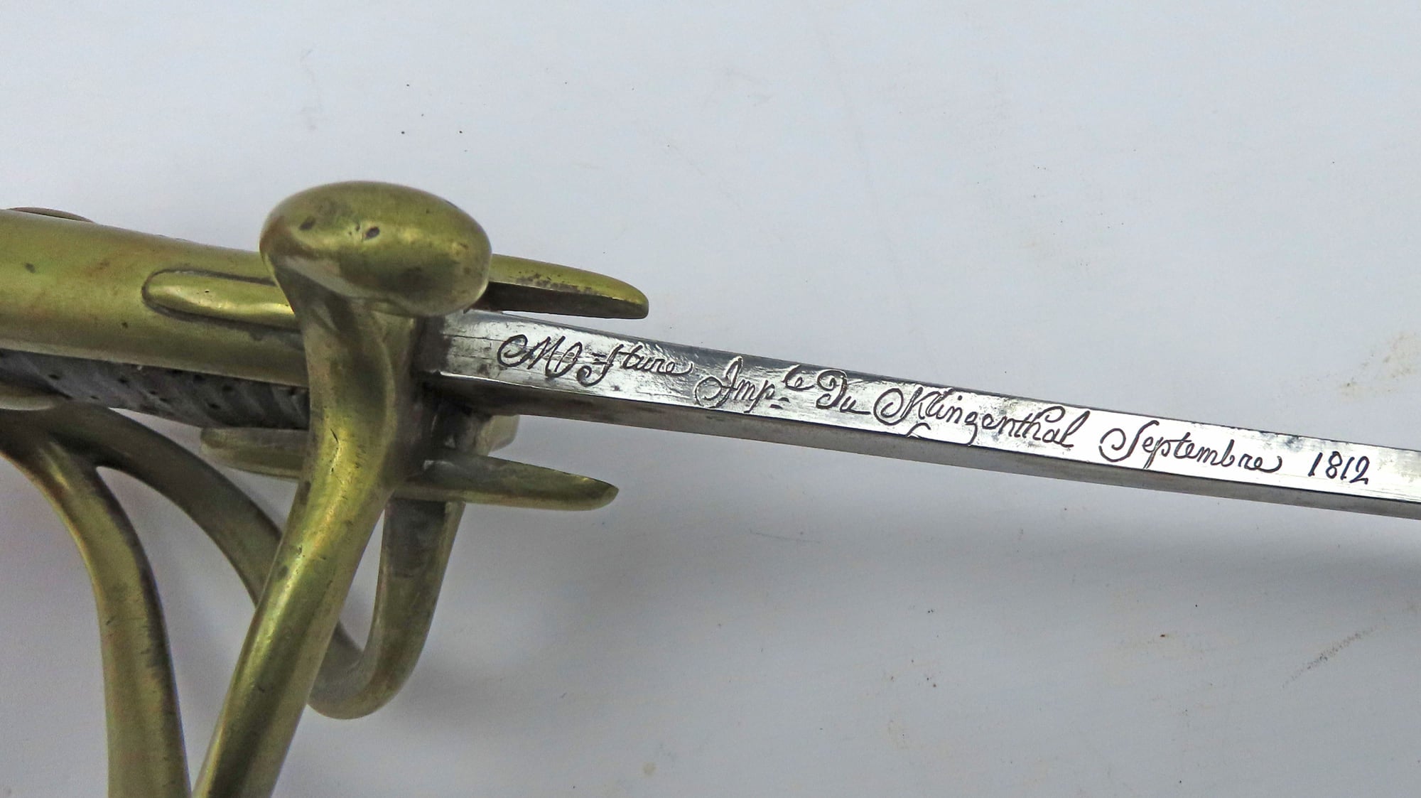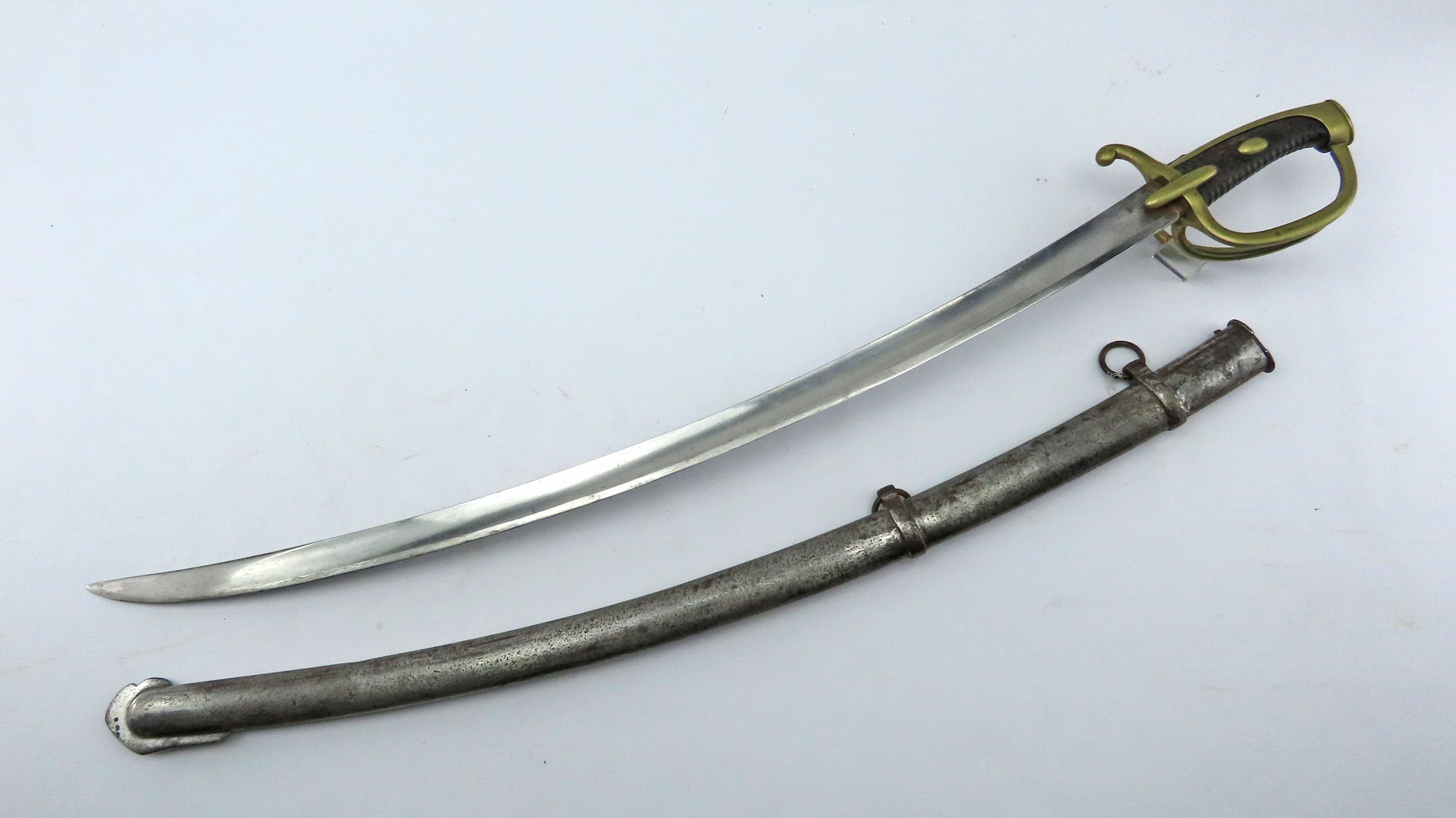 A French Napoleonic AN XI  Light Cavalry Troopers Sword. 40” overall, 34 ½” curved fullered blade with inspector’s poincon of ‘J. Krantz’, back edge engraved ‘M-F’ture Imp du Klingenthal Septembre 1812’. Three bar brass hilt, brass pommel with V stamp, original leather grip with large brass rivet, stamped ‘Versailles’ with other unidentified stamps. In its original heavy steel scabbard with two suspension rings.
